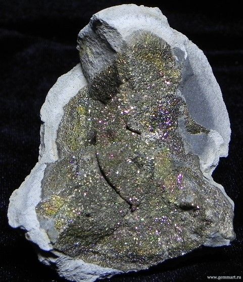 | Описание | Пирит, "спектропирит", в полости конкреции. |