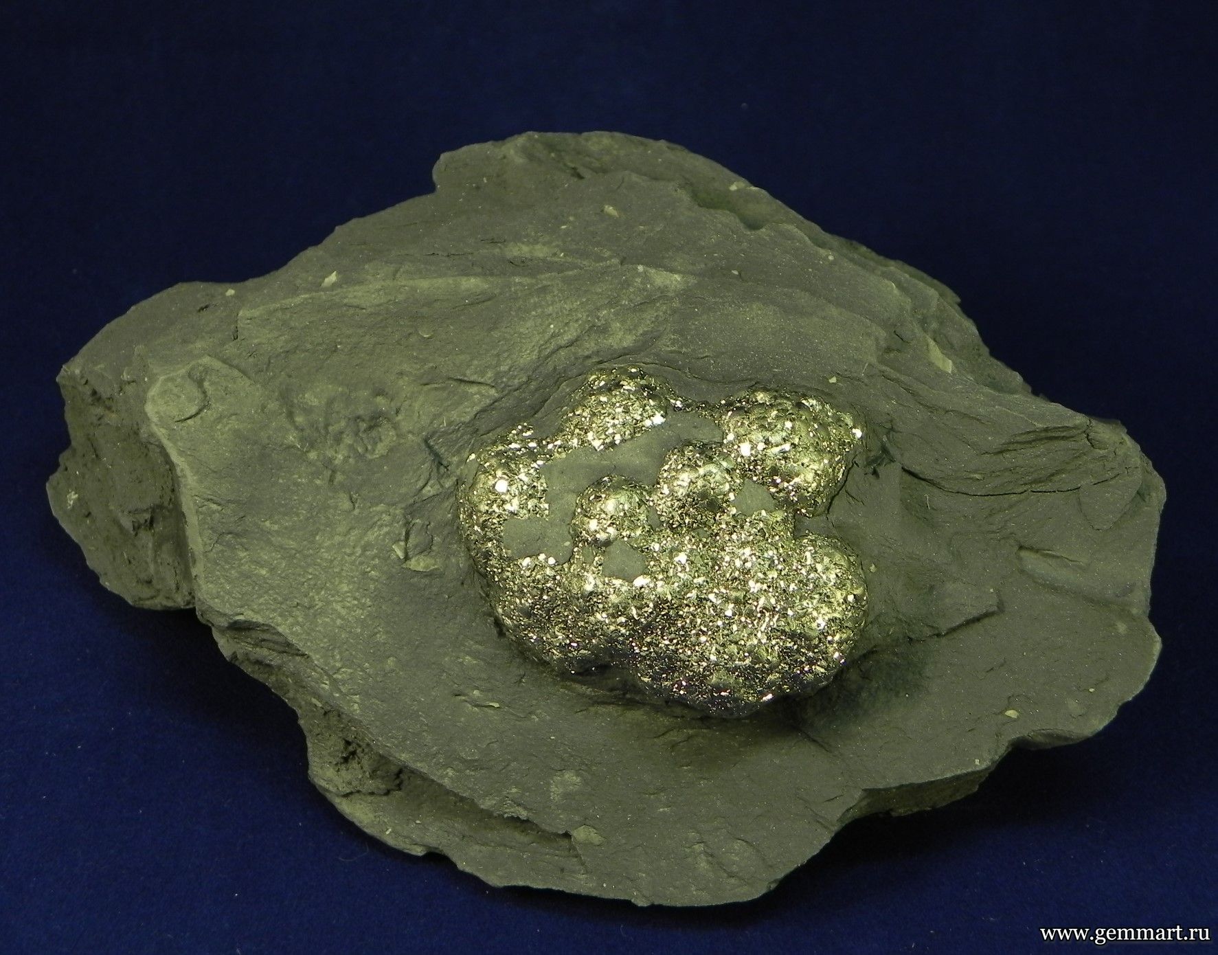 Вес 520г Размеры 130*90*50мм Описание Пирит, конкреция в мергелистой глине. Месторождение р. Джеганас, КЧР, Северный Кавказ, Россия. Формат коллекции Кабинетный / Cabinet - от 60мм до 150мм -