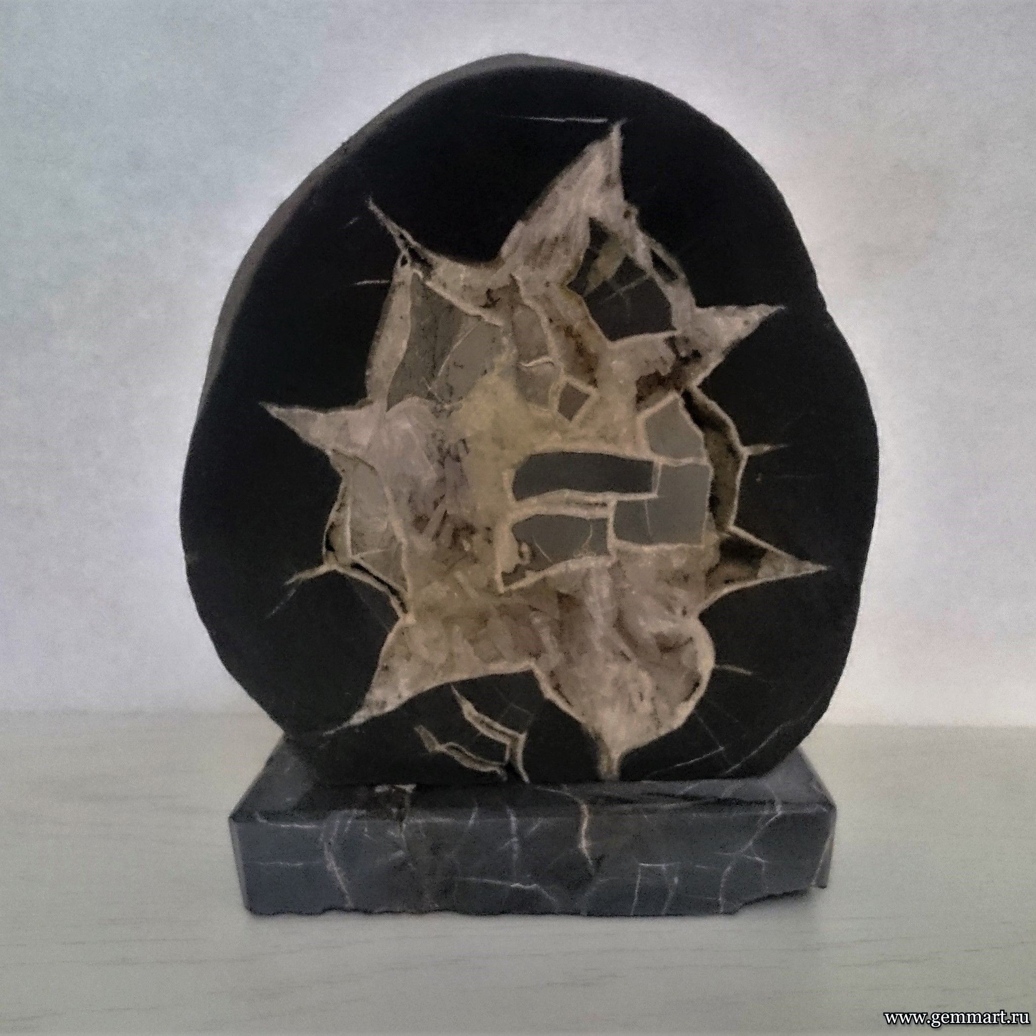 Вес 4000г Размер 242*210*130мм Описание Септария - полированный спил. Месторождение р. Эльтаркач, КЧР, Россия Формат коллекции Музейный / Museum - от 150мм -