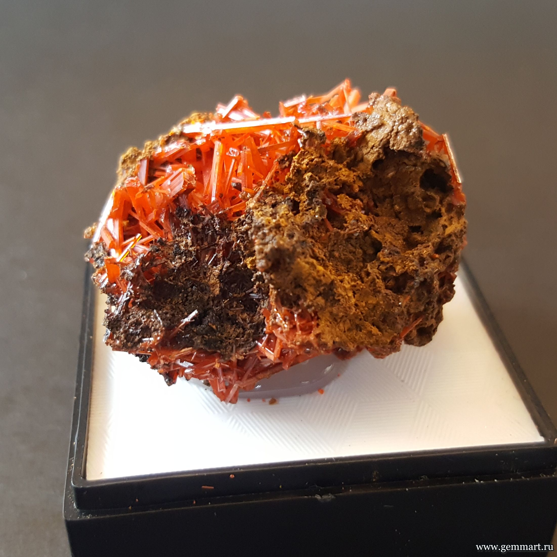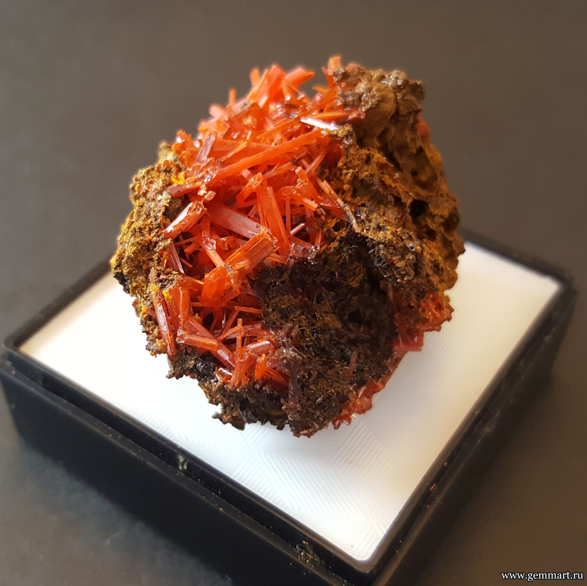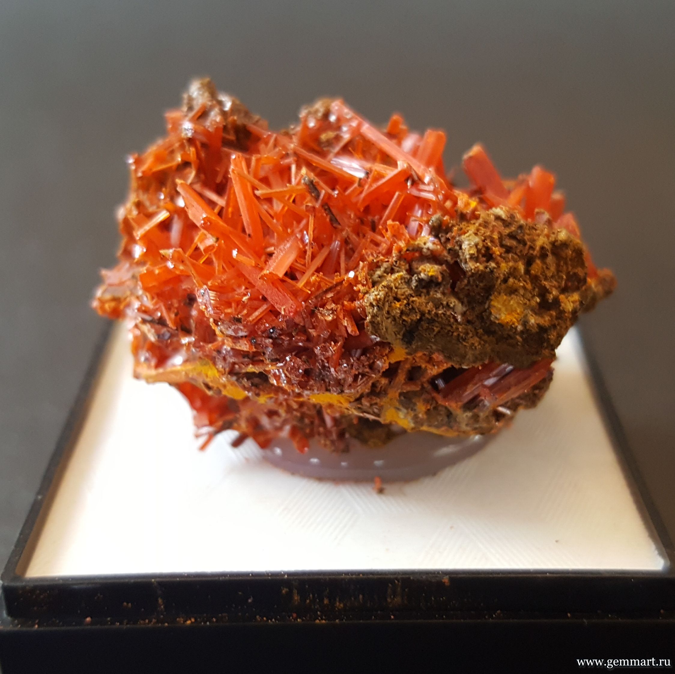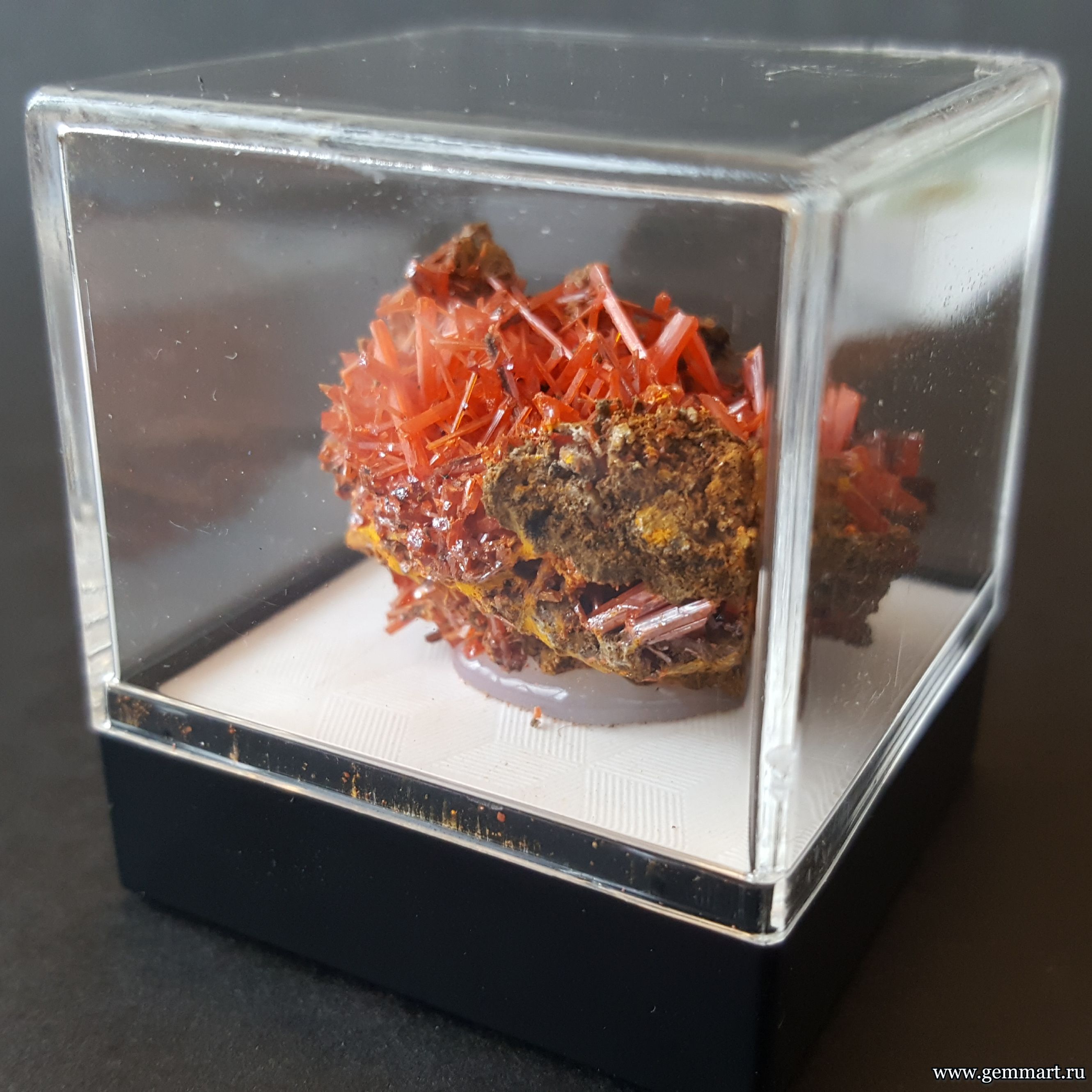 Крокоит — кристаллы на породе в пластиковом боксе. ААА
