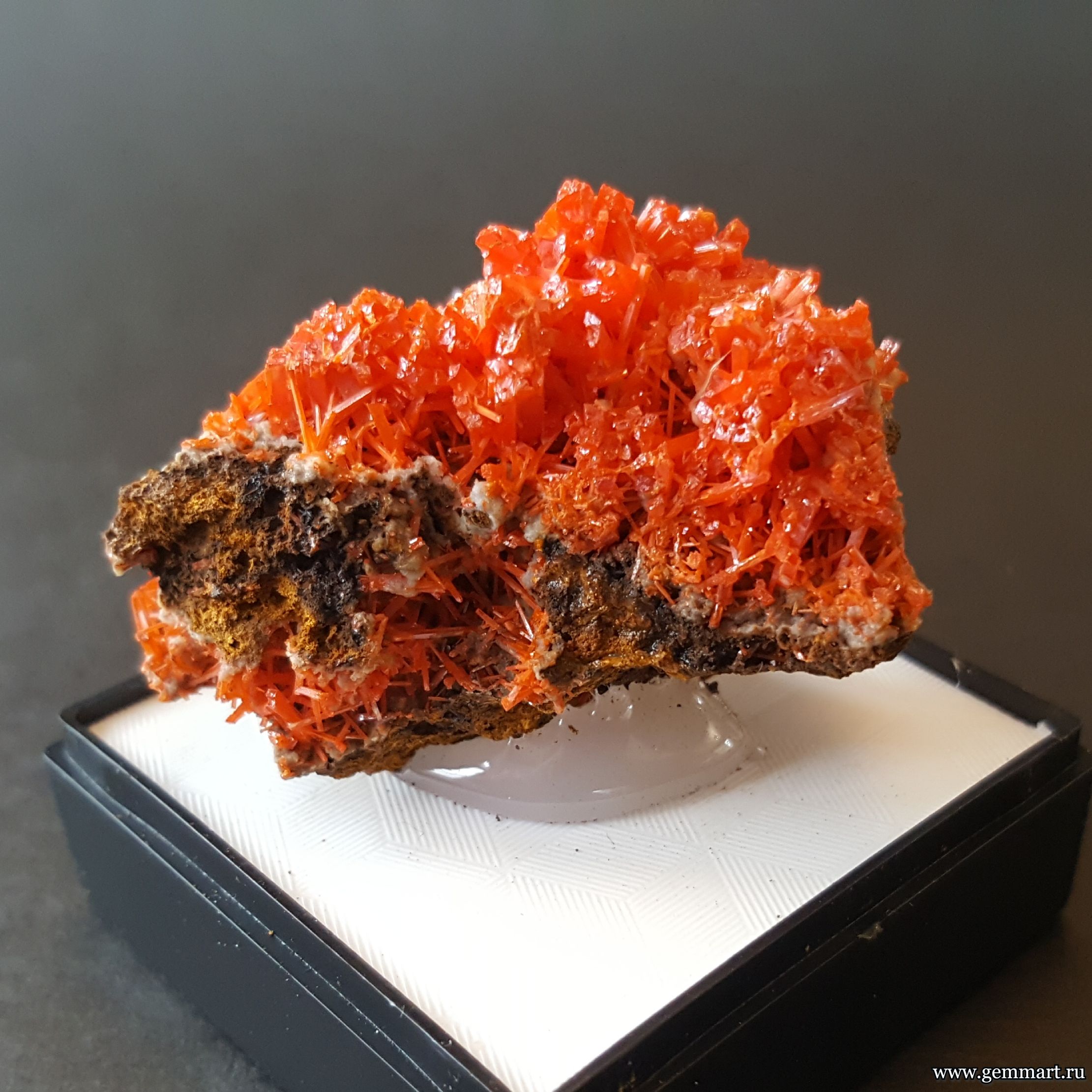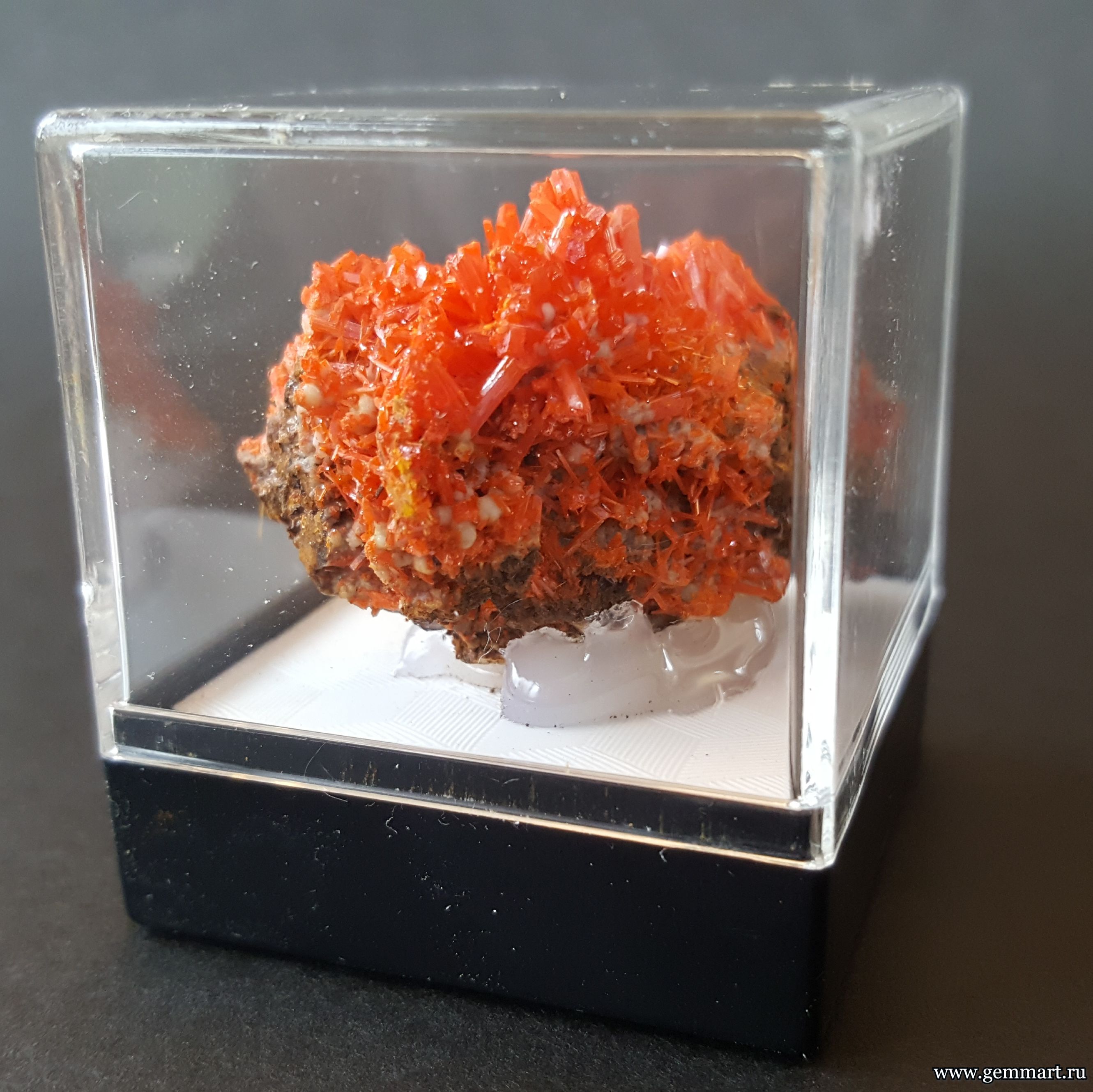 Крокоит — кристаллы на породе в пластиковом боксе. ААА