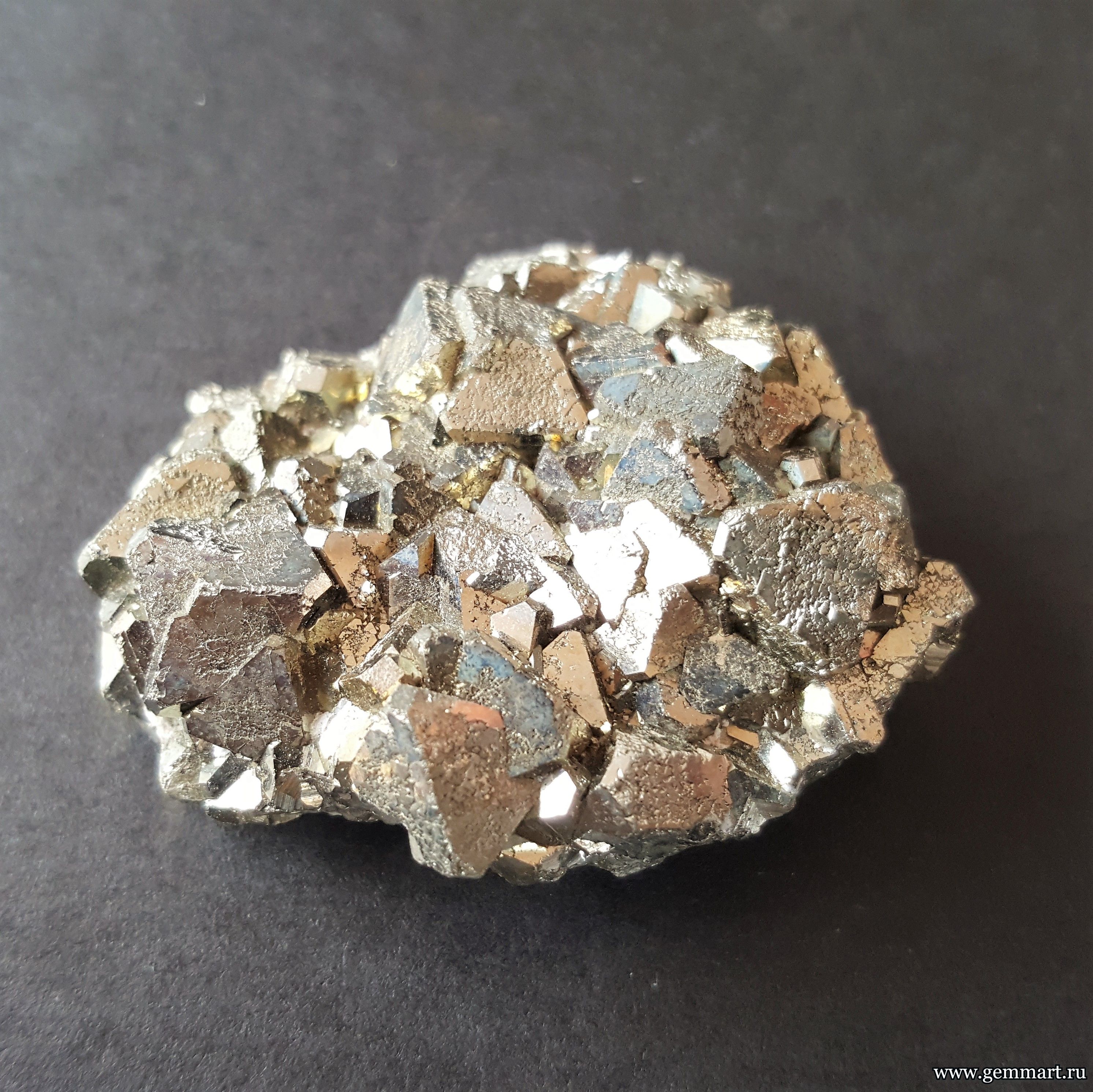 Вес 48г Размер 45*40*15мм Описание Пирит. Сросток октаэдрических кристаллов притупленных гранями пентагондодекаэдра. Месторождение Перу Формат коллекции Миниатюра / Miniature - от 10 до 60мм -