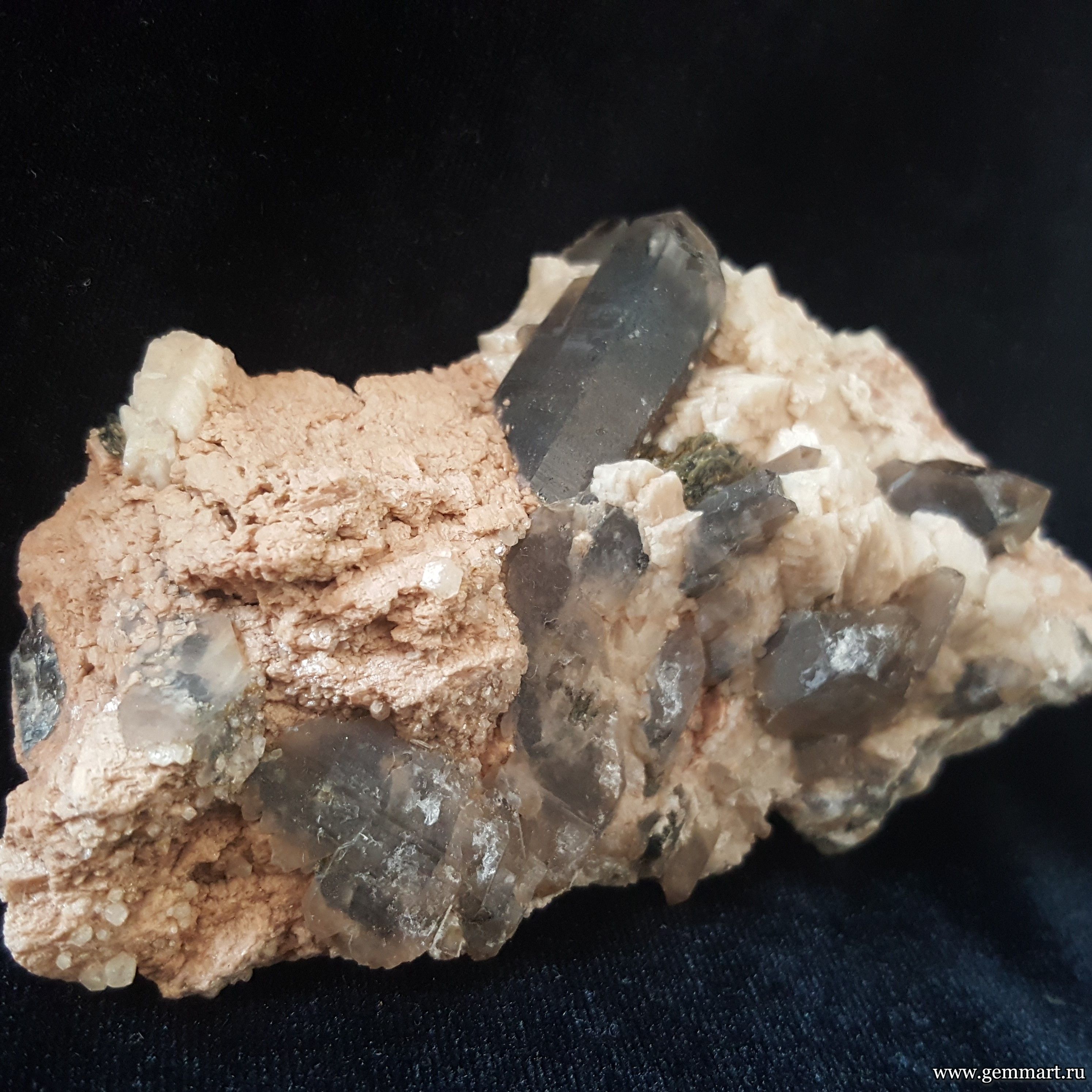 Вес Размер 75*56*15мм Описание Дымчатый кварц на микроклине. Месторождение Казахстан. Формат коллекции Кабинетный / Cabinet - от 60мм до 150мм -