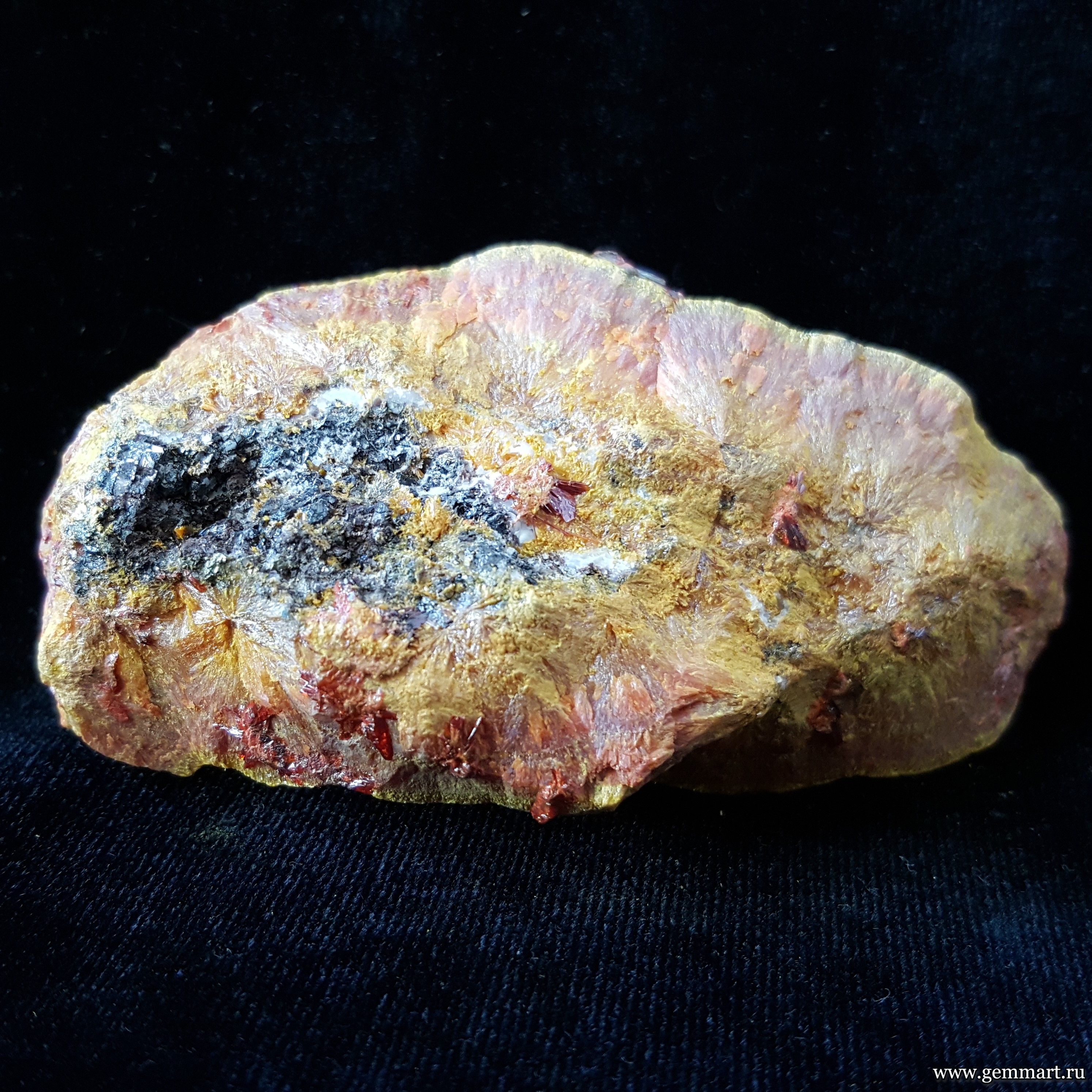 Вес 130г Размер 76*42*32мм Описание Аурипигмент, реальгар. Месторождение Перу. Формат коллекции Кабинетный / Cabinet - от 60мм до 150мм -