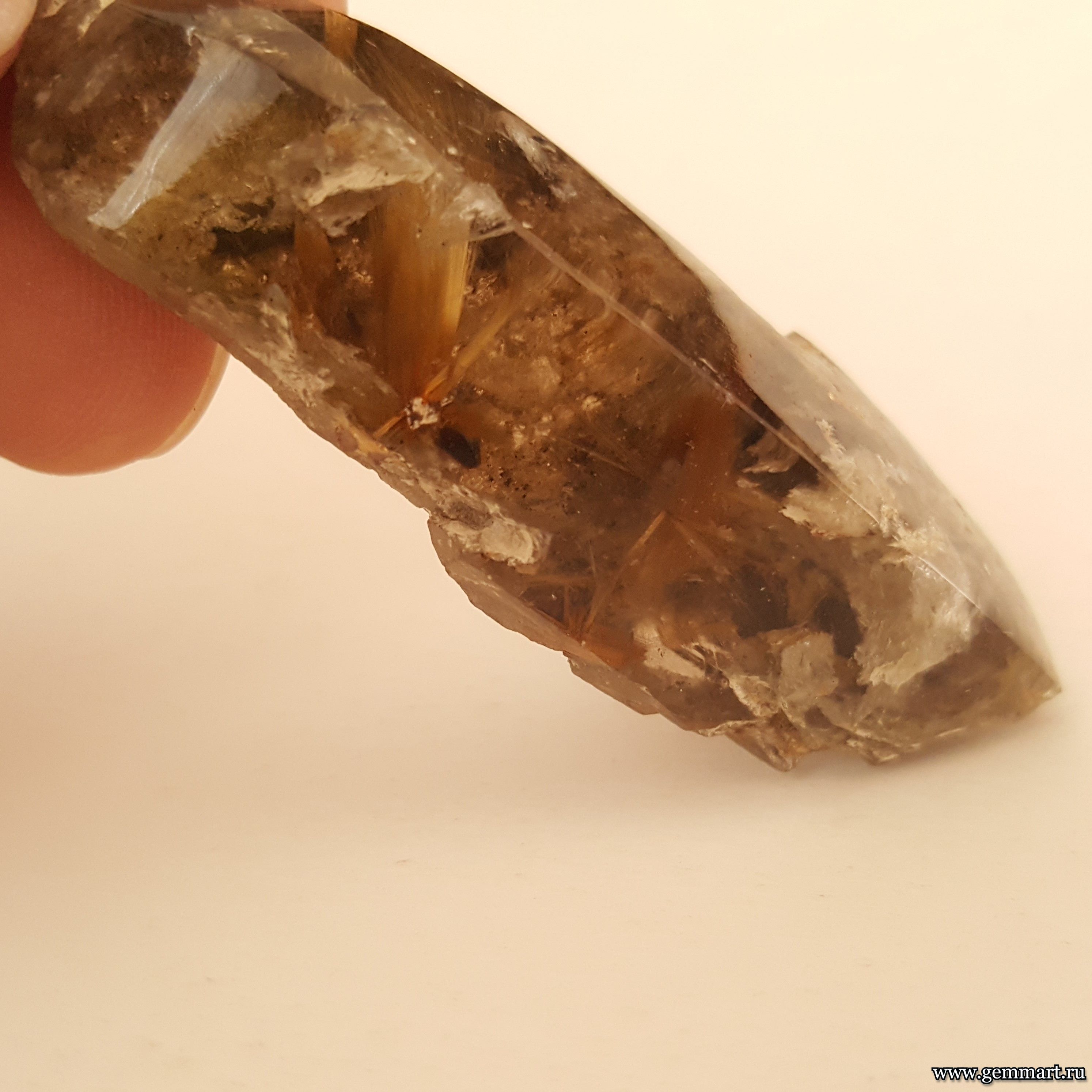 Вес 27г Размер 65*25*20мм Описание Дымчатый кварц с включением рутила и кварцит-сирицитового сланца. Полировка. Месторождение Приполярный Урал. Россия. Формат коллекции Миниатюра / Miniature - от 10 до 60мм -