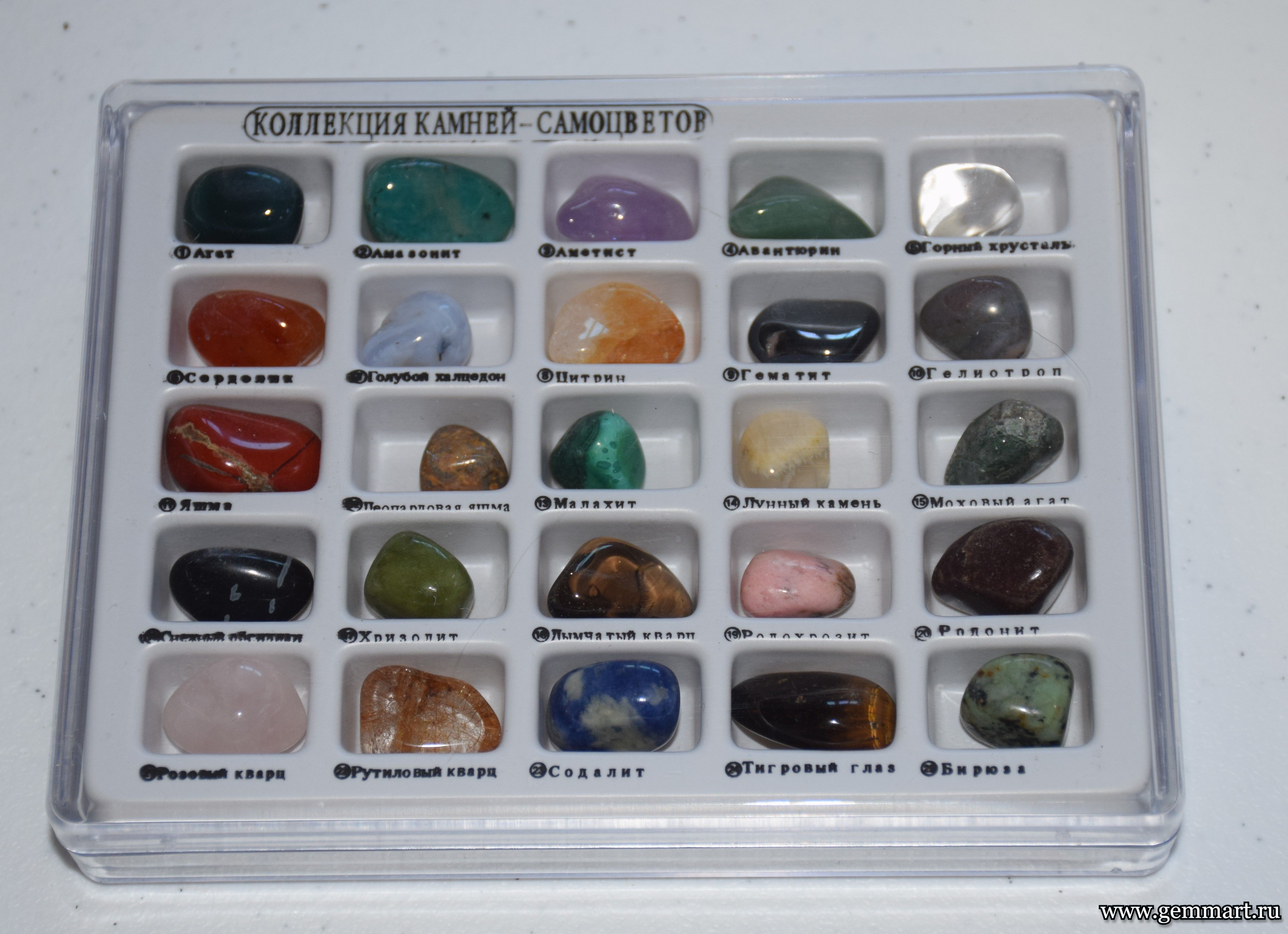 | Описание | Коллекция минералов из образцов "Коллекция камней - Самоцветов" - галтовка. Название минералов указаны лицевой стороне пластикового органайзера и на листе вкладыше с обратной стороны коробки. |