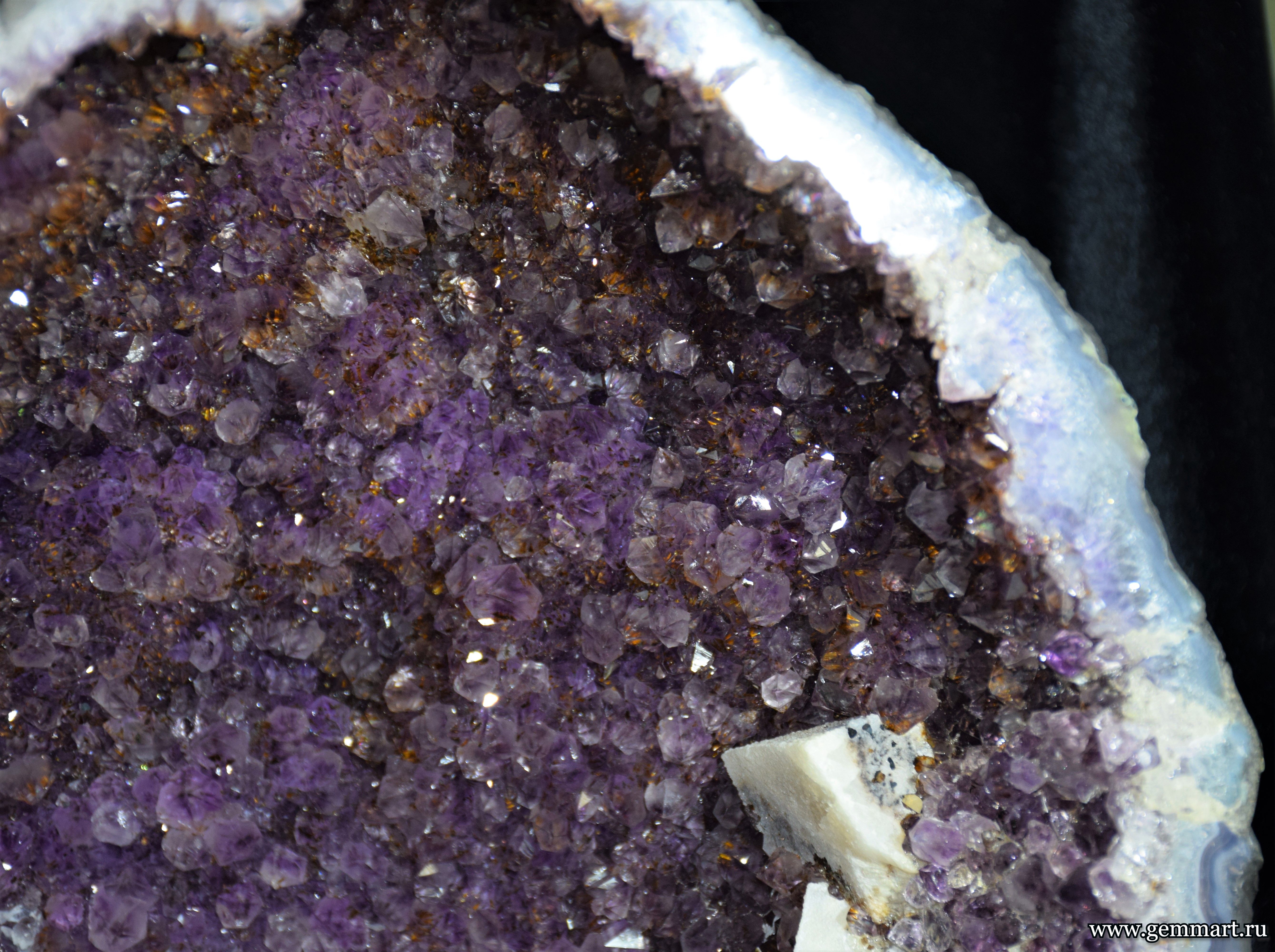 | Описание | Жеода кристаллов аметиста с включениями гематита и кристаллами кальцита на агатовой подложке. |