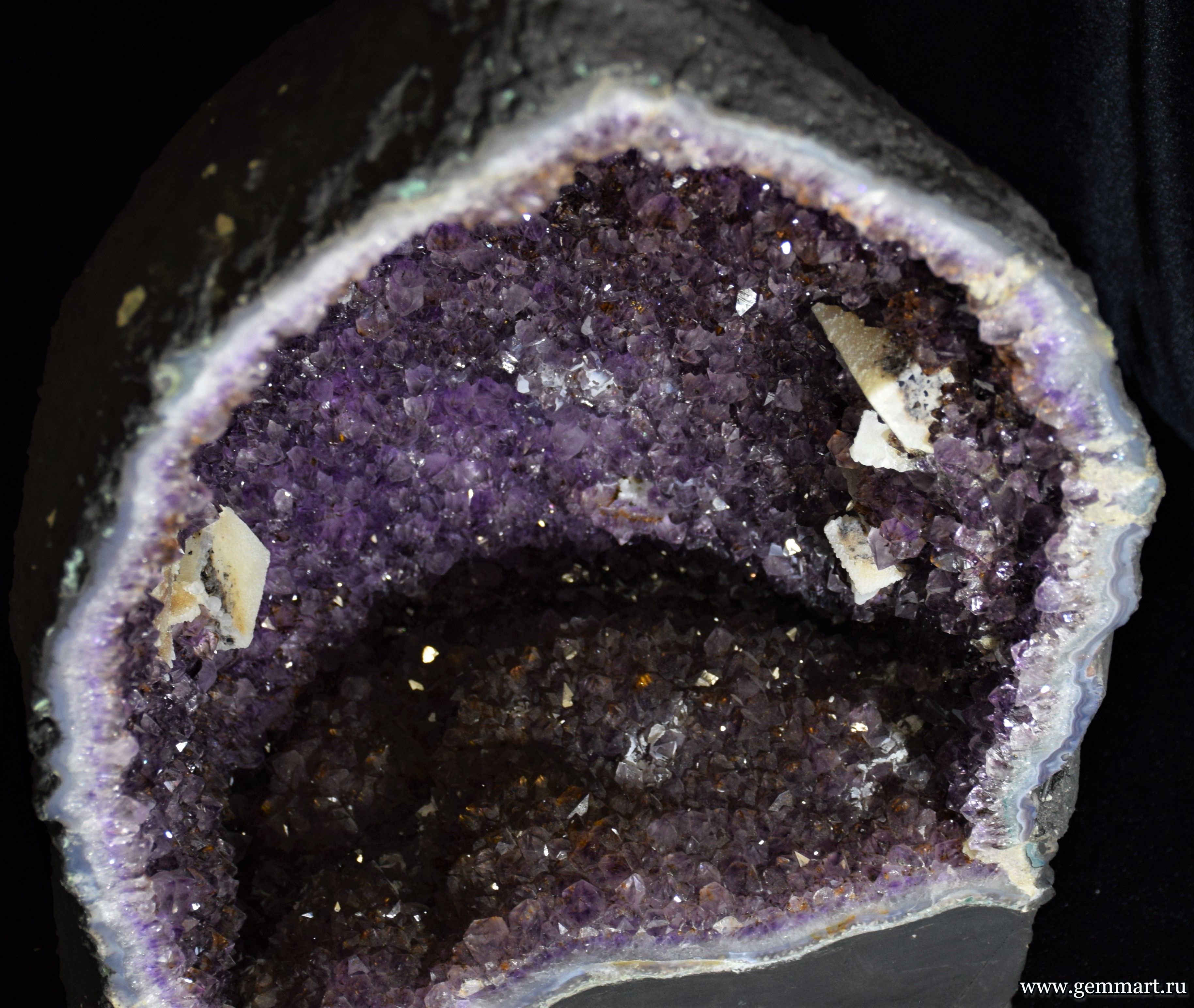 Аметист (разн. кварца), жеода кристаллов, с включениями гематита, кальцит в полости агата. (ААА)