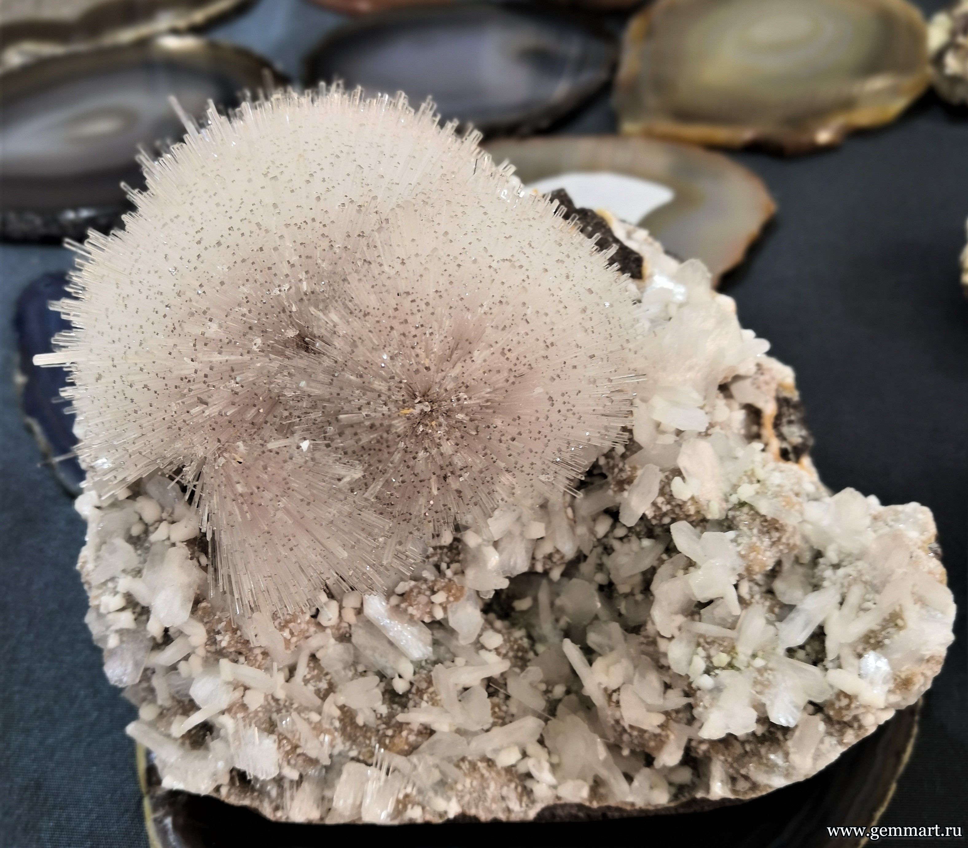 Вес 395г Размер 105*90*70мм Описание Лучистые агегаты сколецита и стильбит в полости базальта. Месторождение Насик. Индия. Формат коллекции Кабинетный / Cabinet - от 60мм до 150мм -