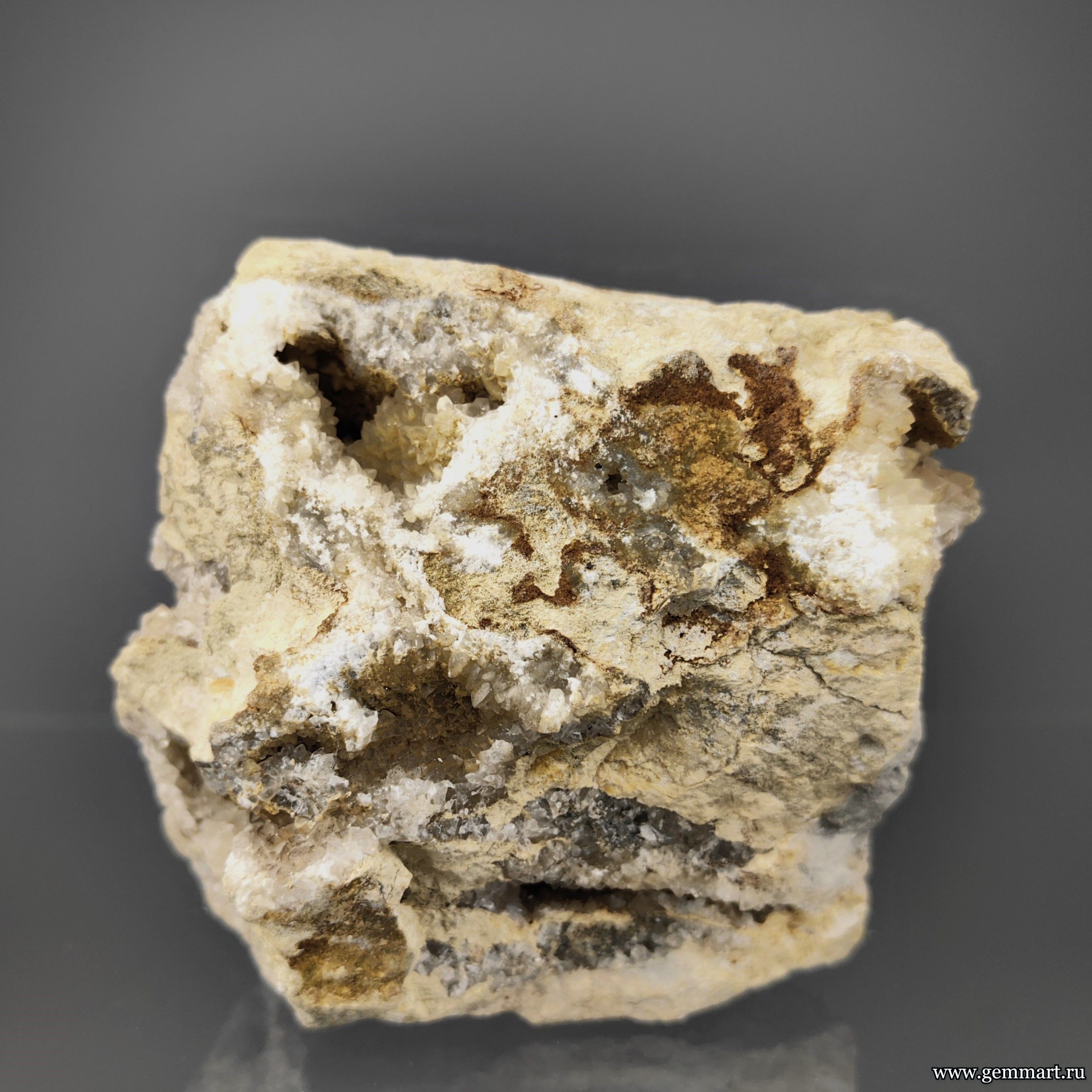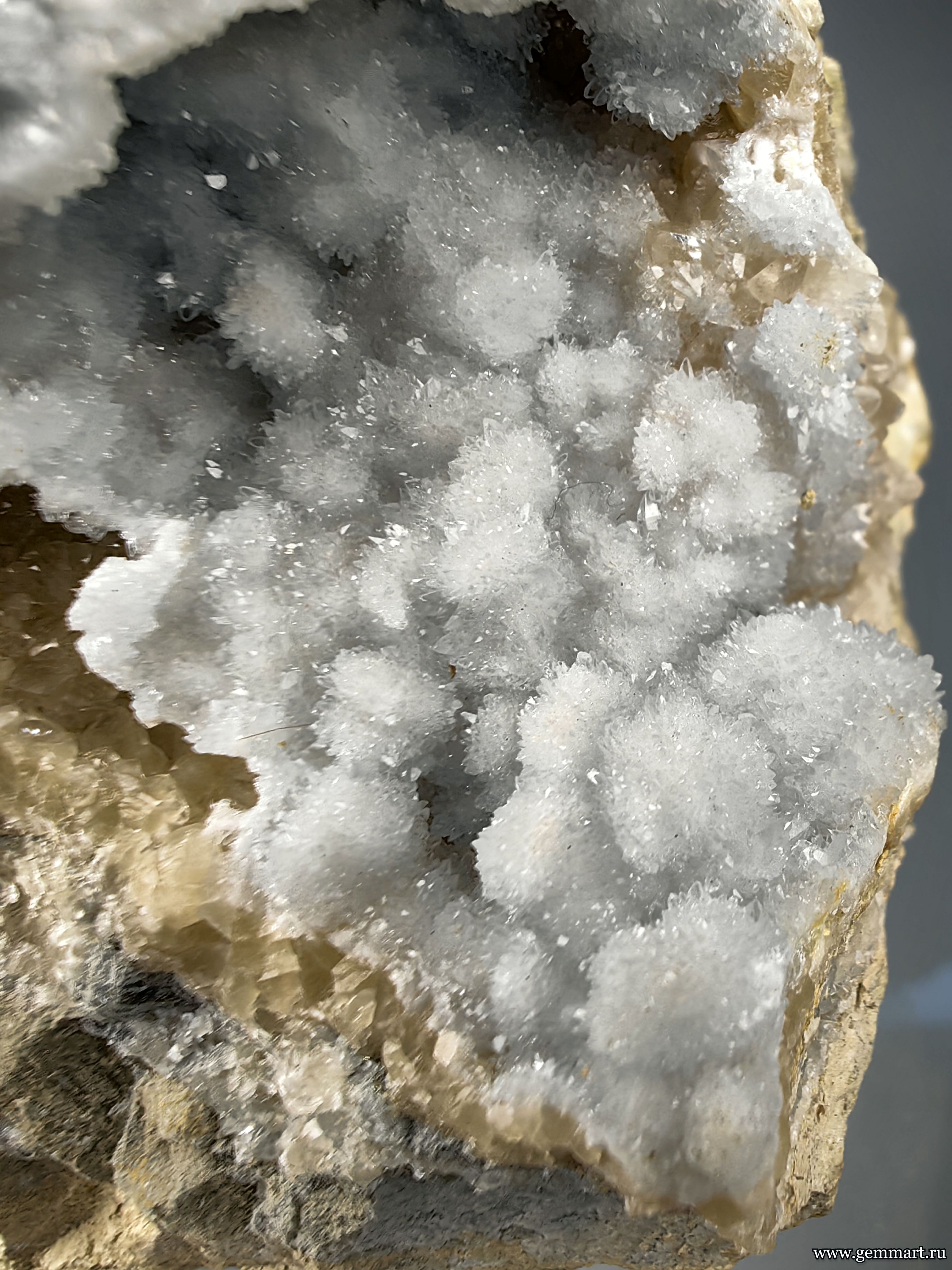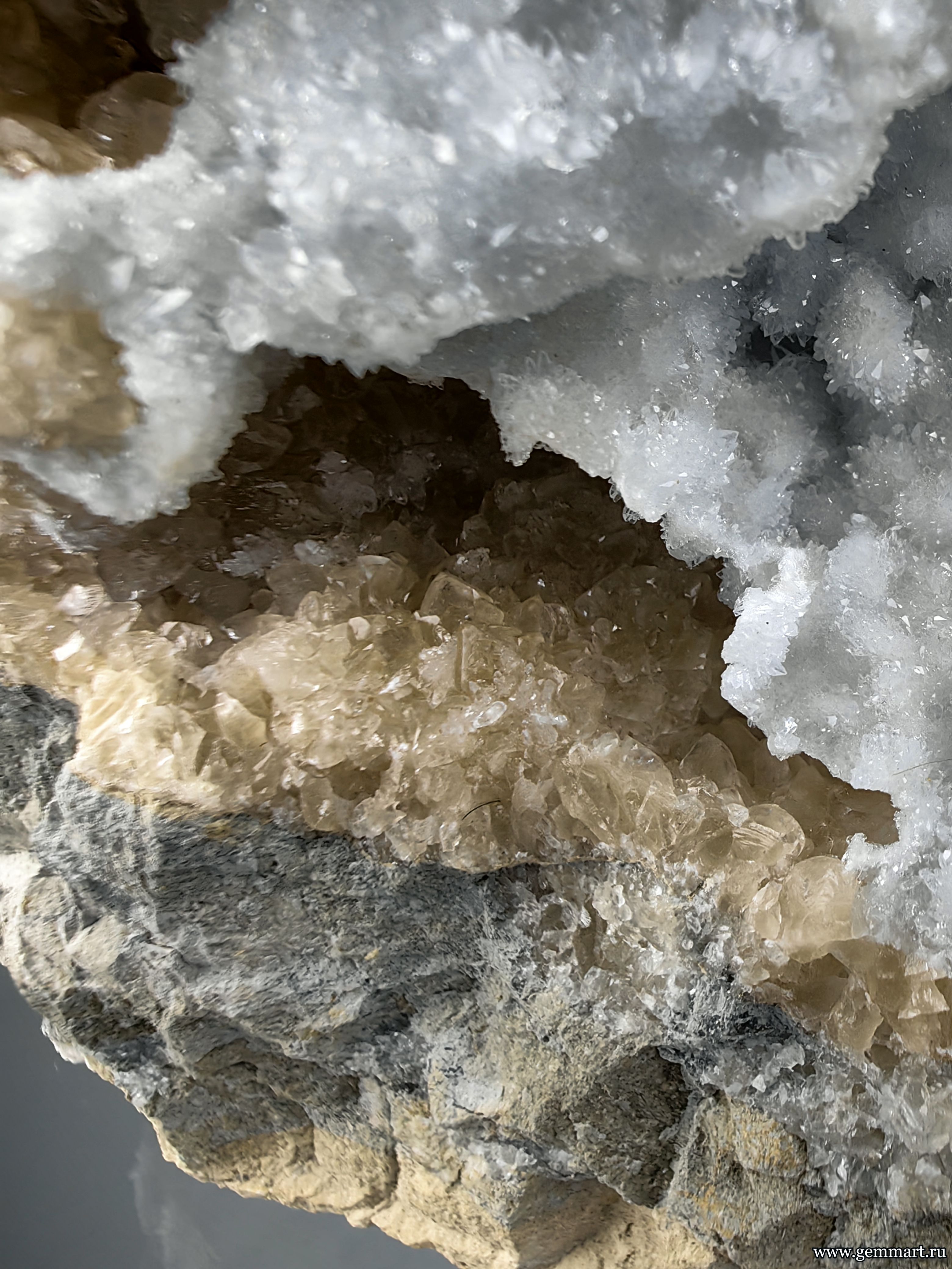 Вес 650г Размер 80*80*70мм Описание Целестин слегка голубой и медовый кальцит в мергеле. Мнещающая порода обработана пропиткой для исклучения растрескивания. Месторождение Синие камни. Дагестан. Россия. Формат коллекции Кабинетный / Cabinet - от 60мм до 150мм -