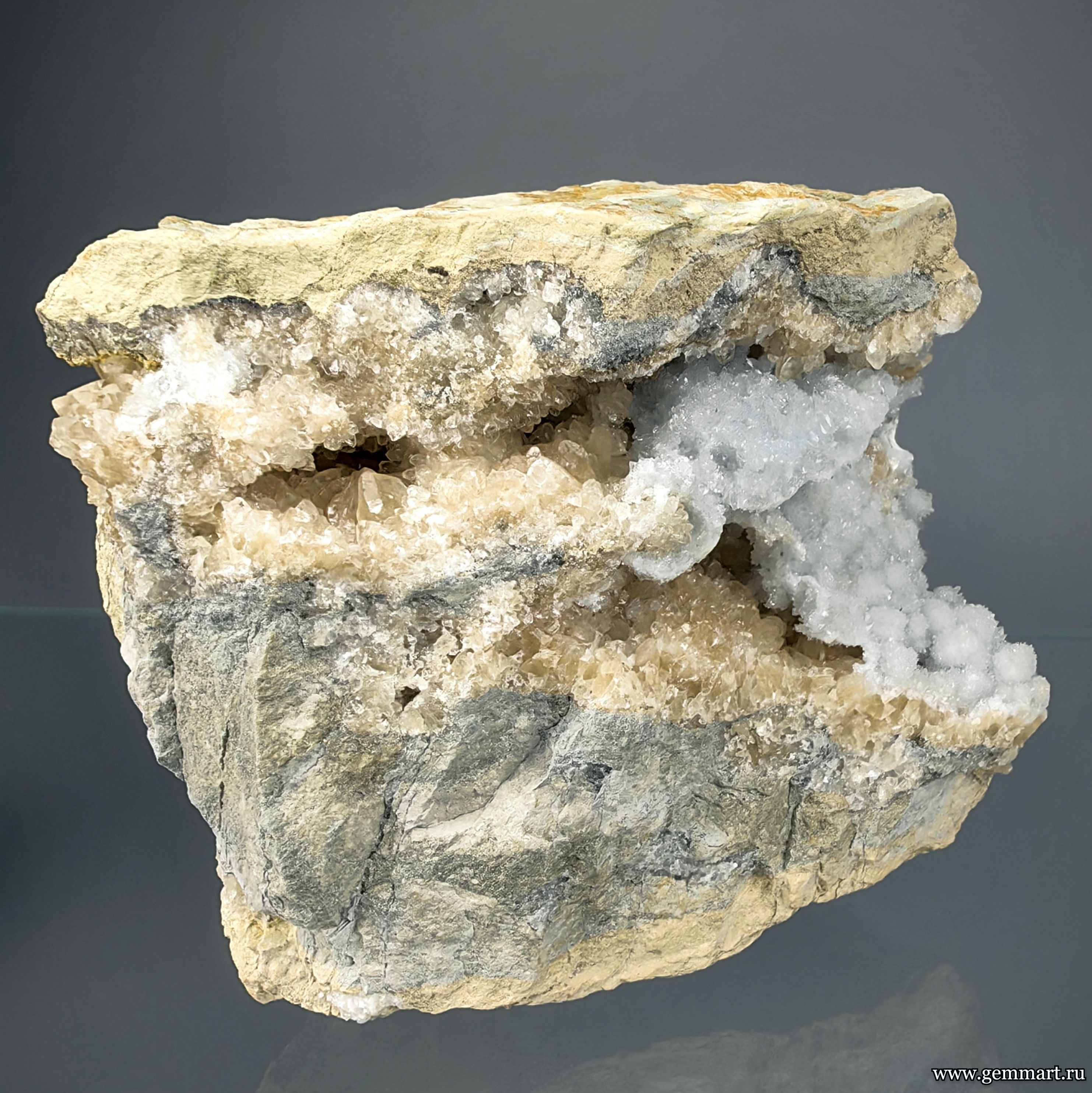 | Описание | Целестин слегка голубой и медовый кальцит в мергеле. Мнещающая порода обработана пропиткой для исклучения растрескивания. |