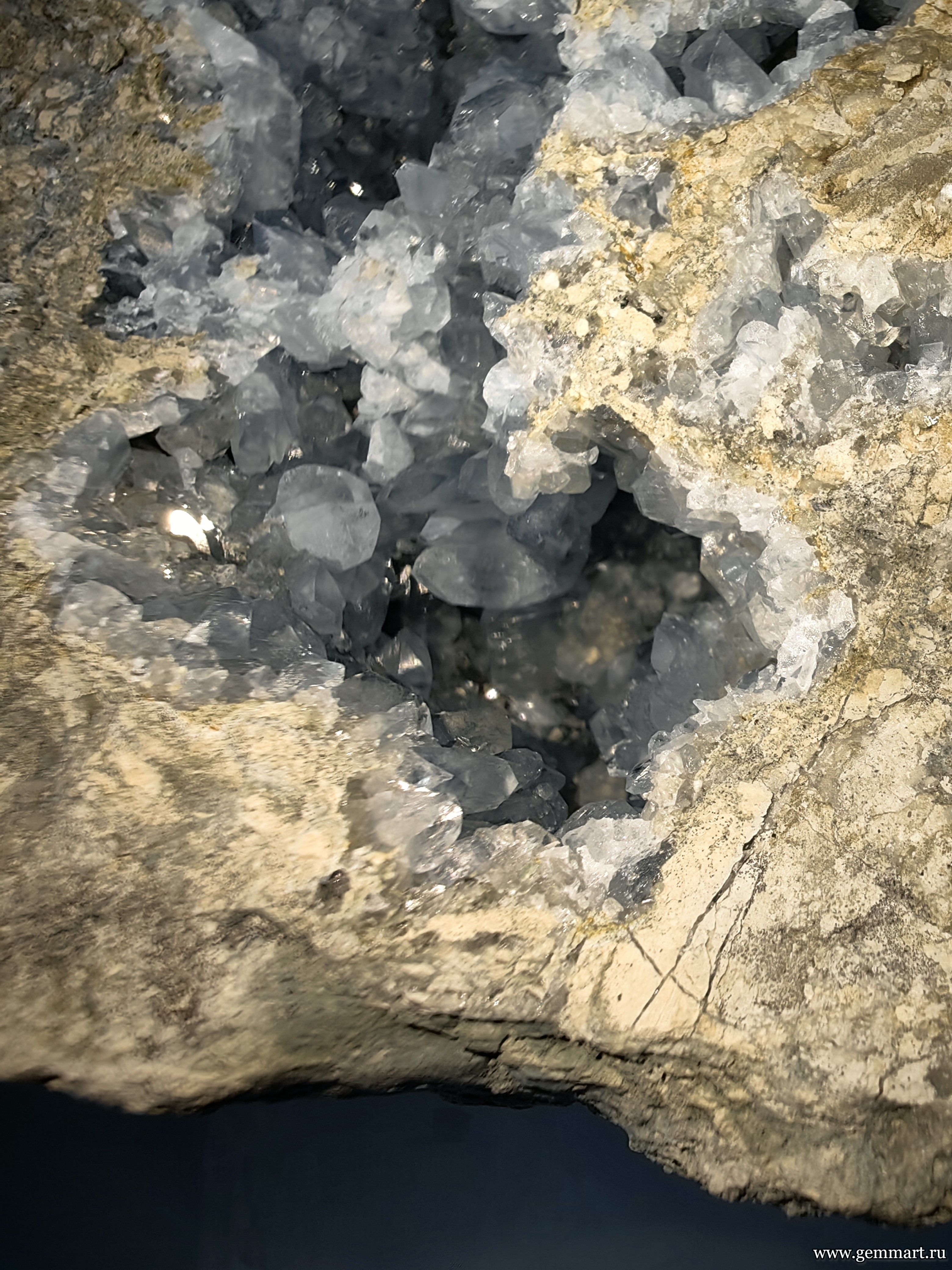 | Описание | Целестин слегка голубой, жеода в мергеле. |