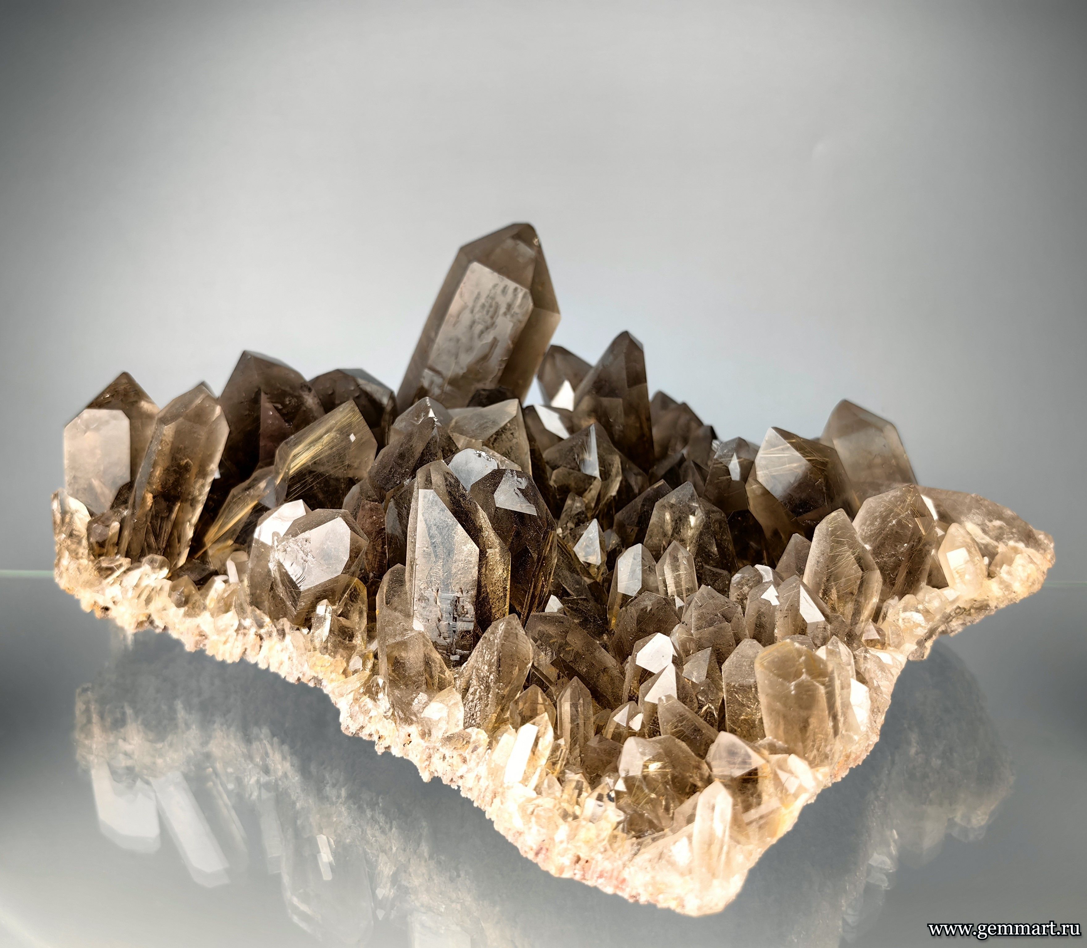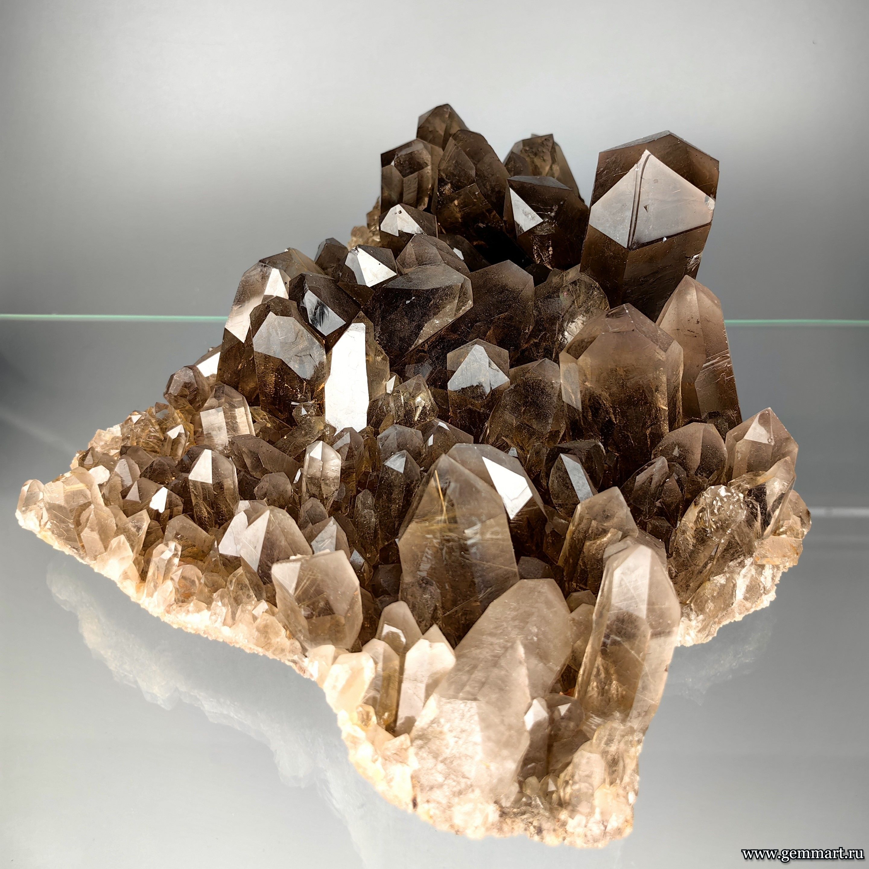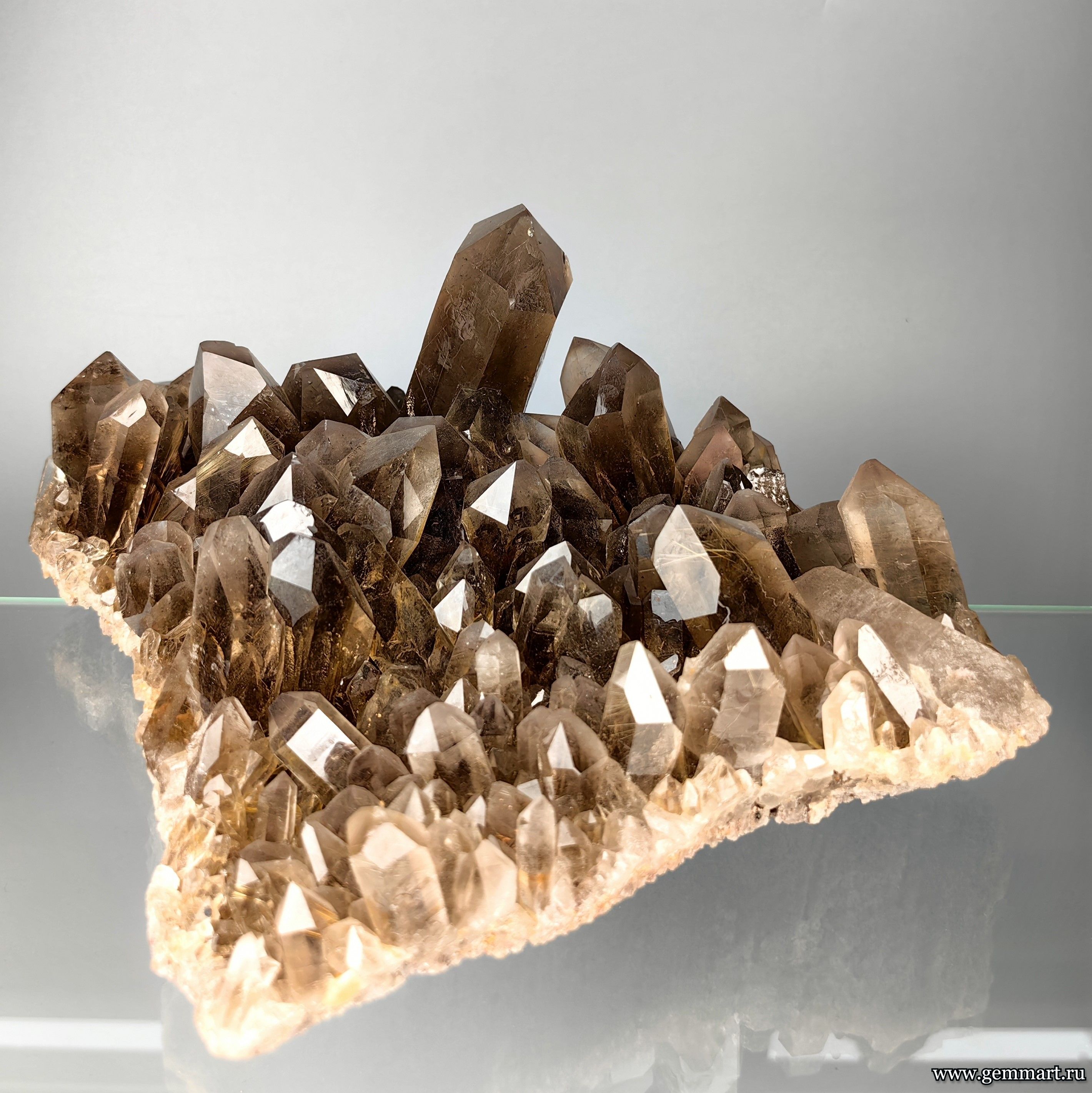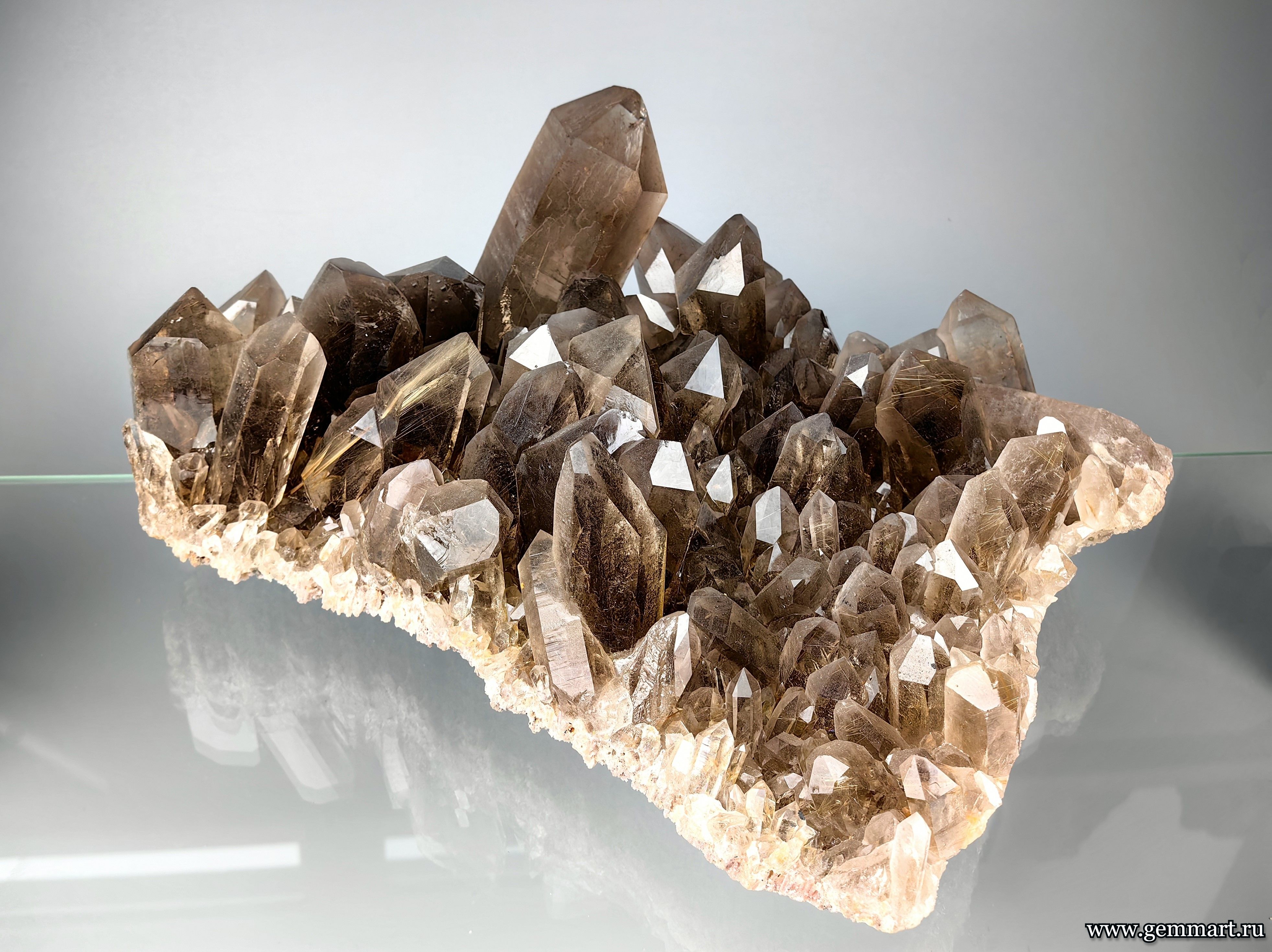 Вес 2650г Размер 260*220*103мм Описание Друза дымчатого кварца с включениями золотистого рутила. Месторождение Novo Horizonte. Bahia. Бразилия. Формат коллекции Музейный / Museum - от 150мм -