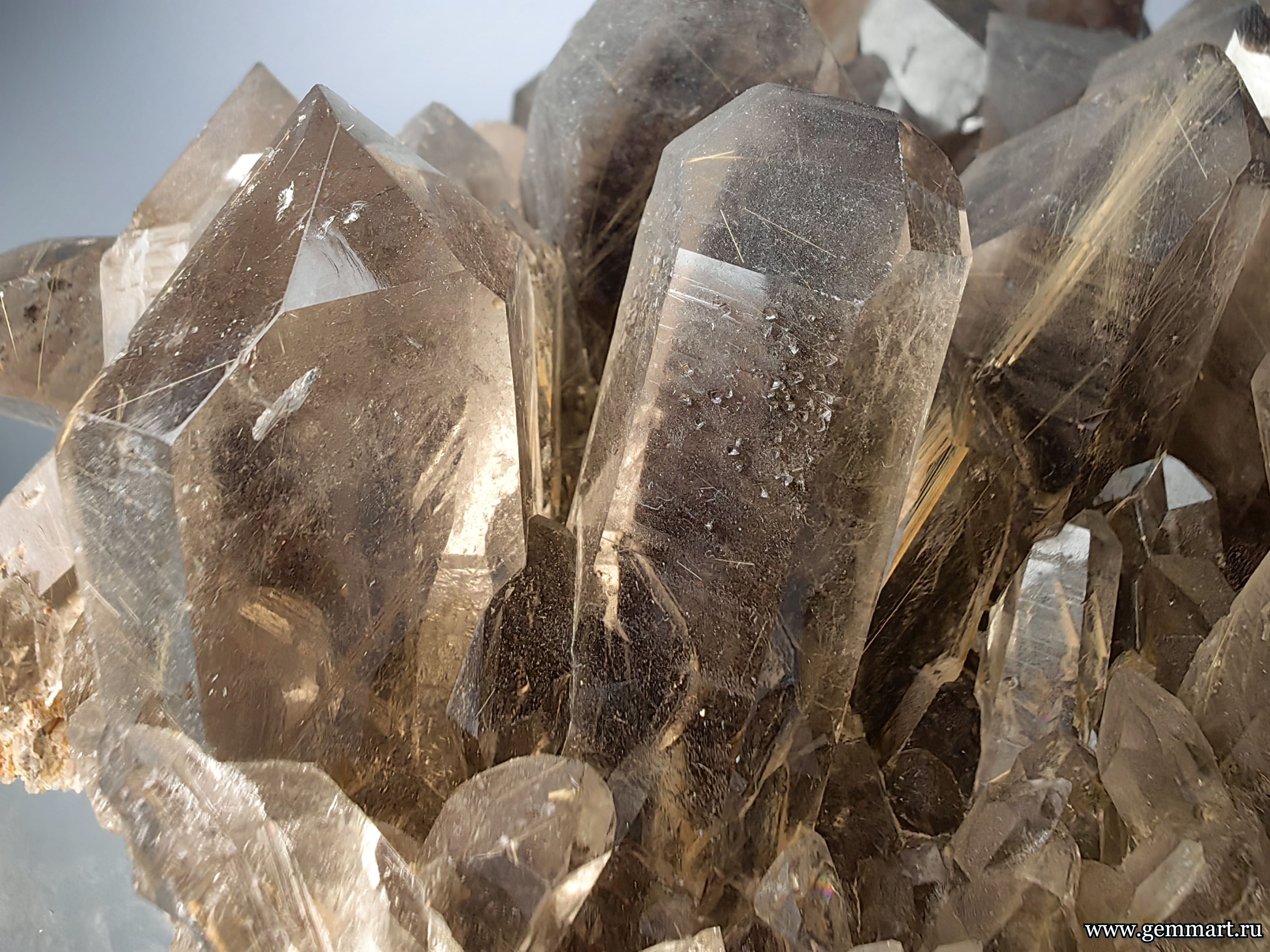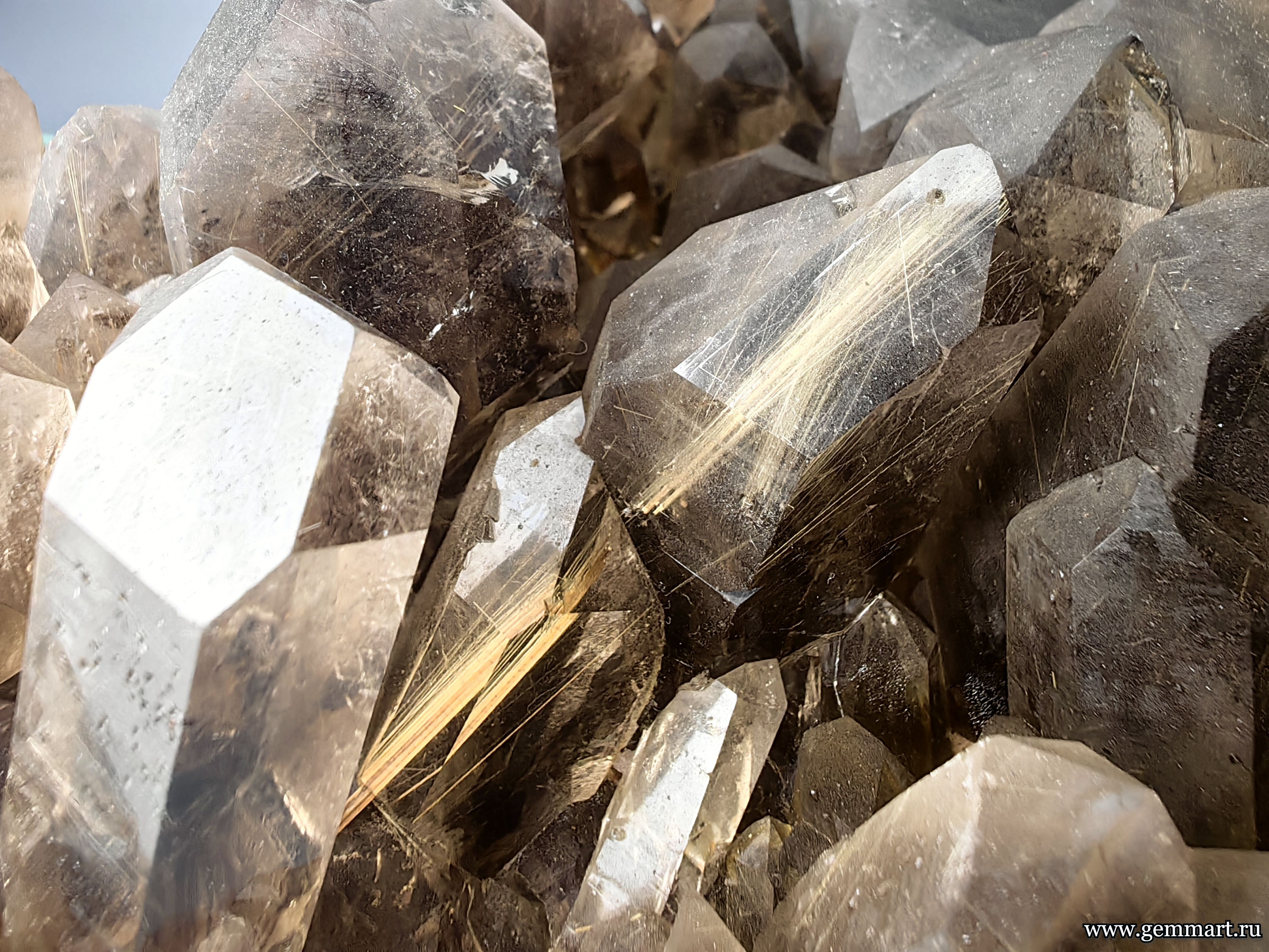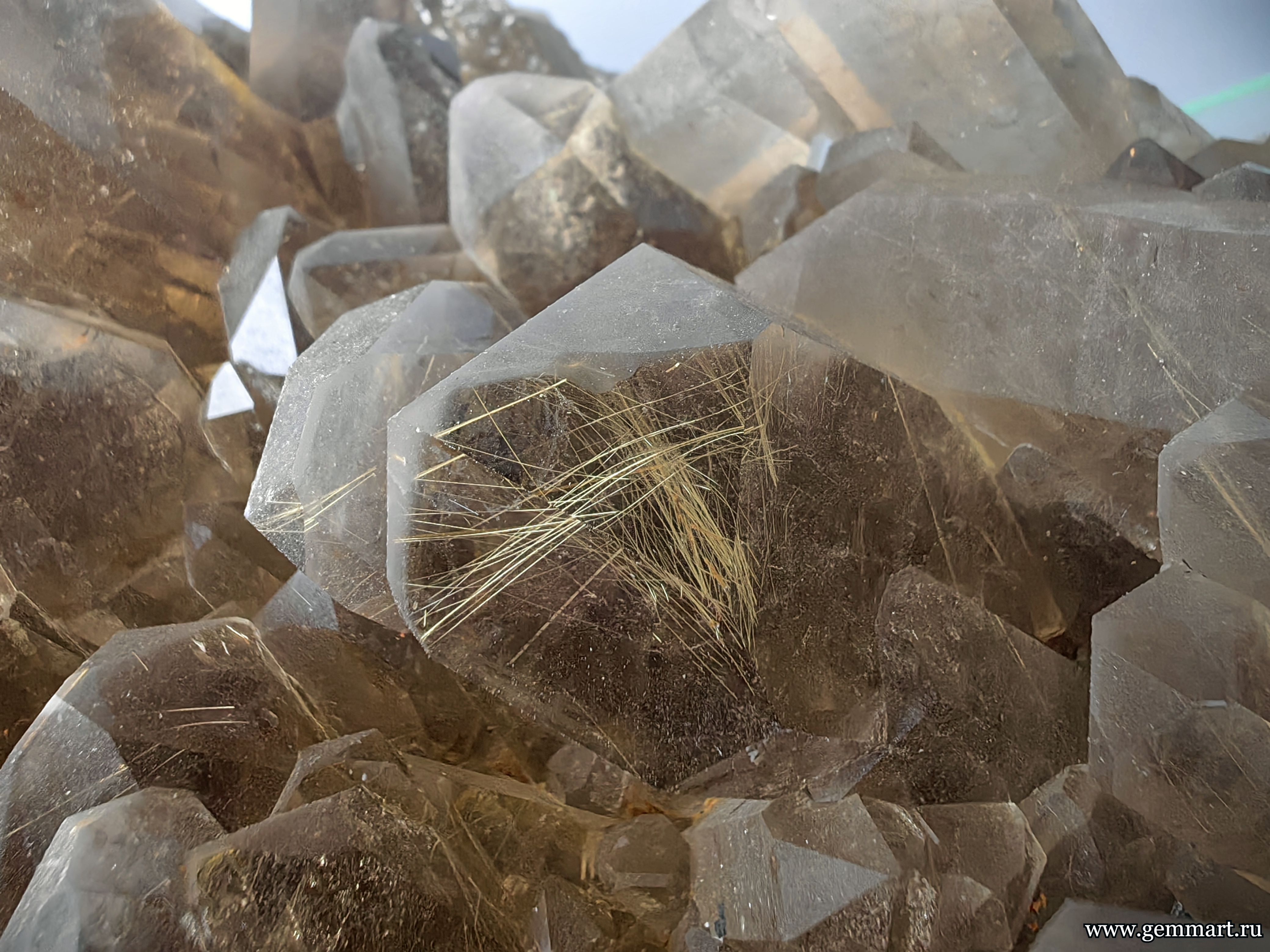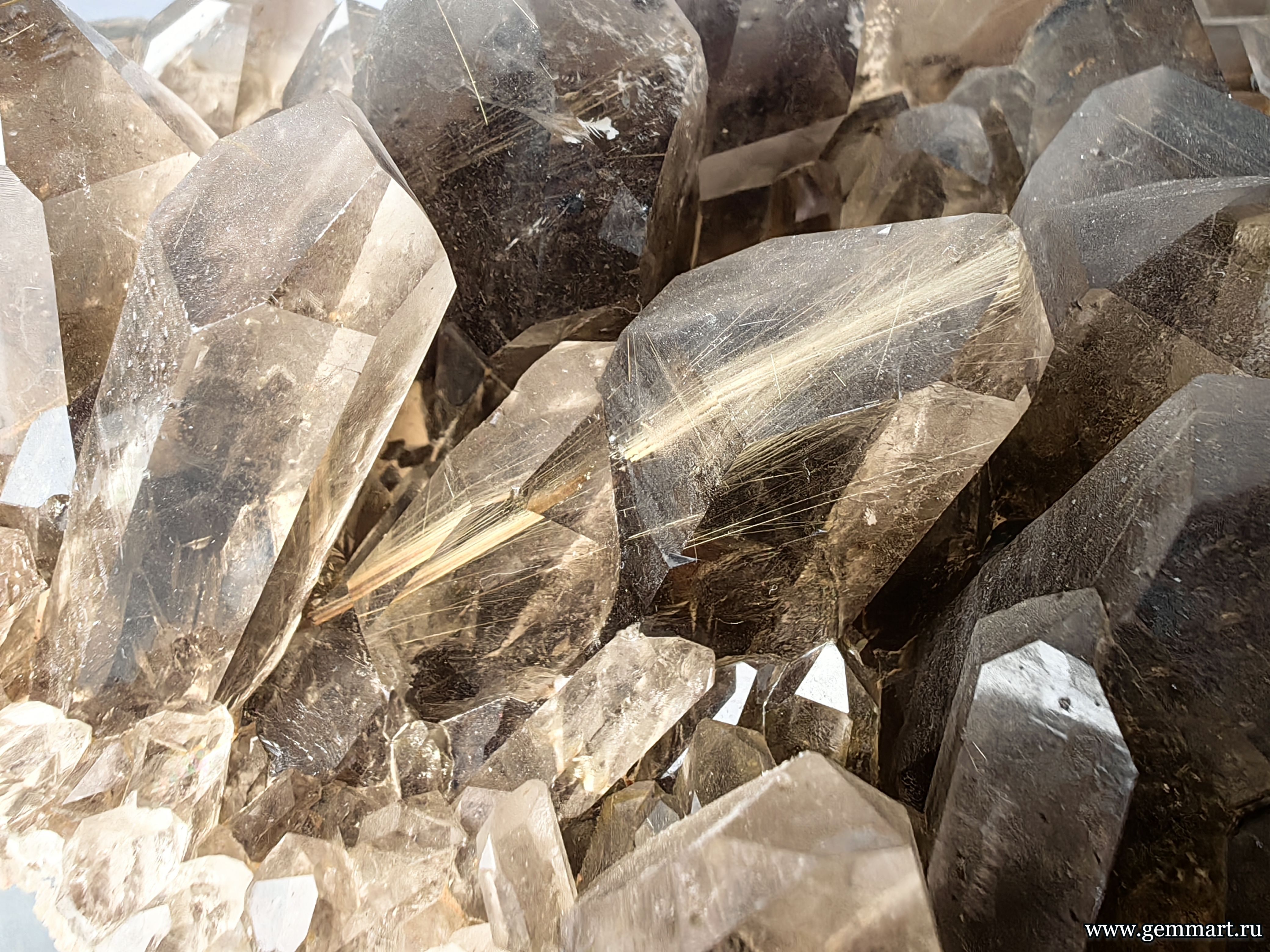 | Описание | Друза дымчатого кварца с включениями золотистого рутила. |
