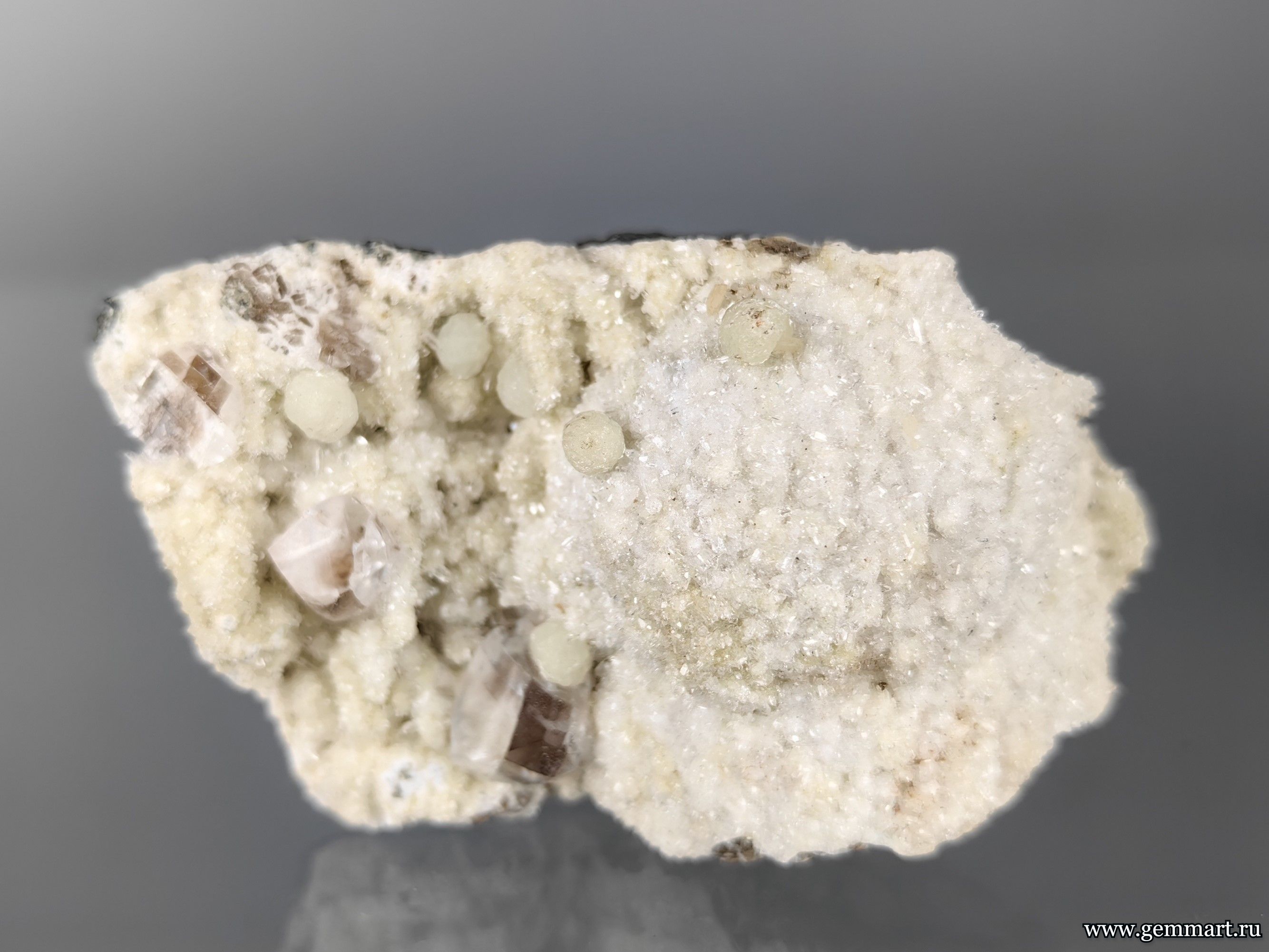 Вес 80г Размер 60*45*30мм Описание Кальцит, пренит, сферолиты на стильбите. Месторождение India Формат коллекции Миниатюра / Miniature - от 10 до 60мм -