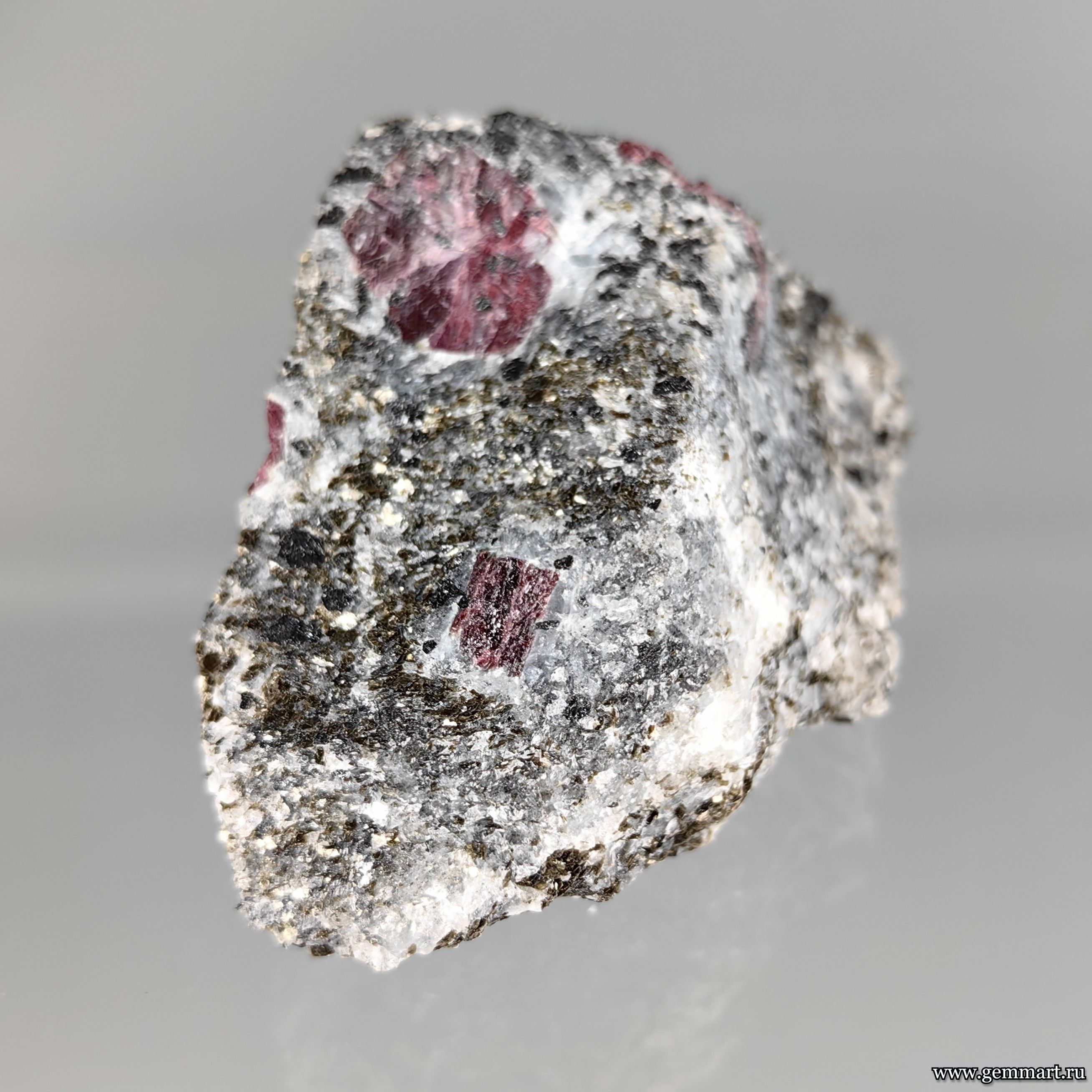 | Описание | Корунд, фрагмент кристалла в слюдите. |