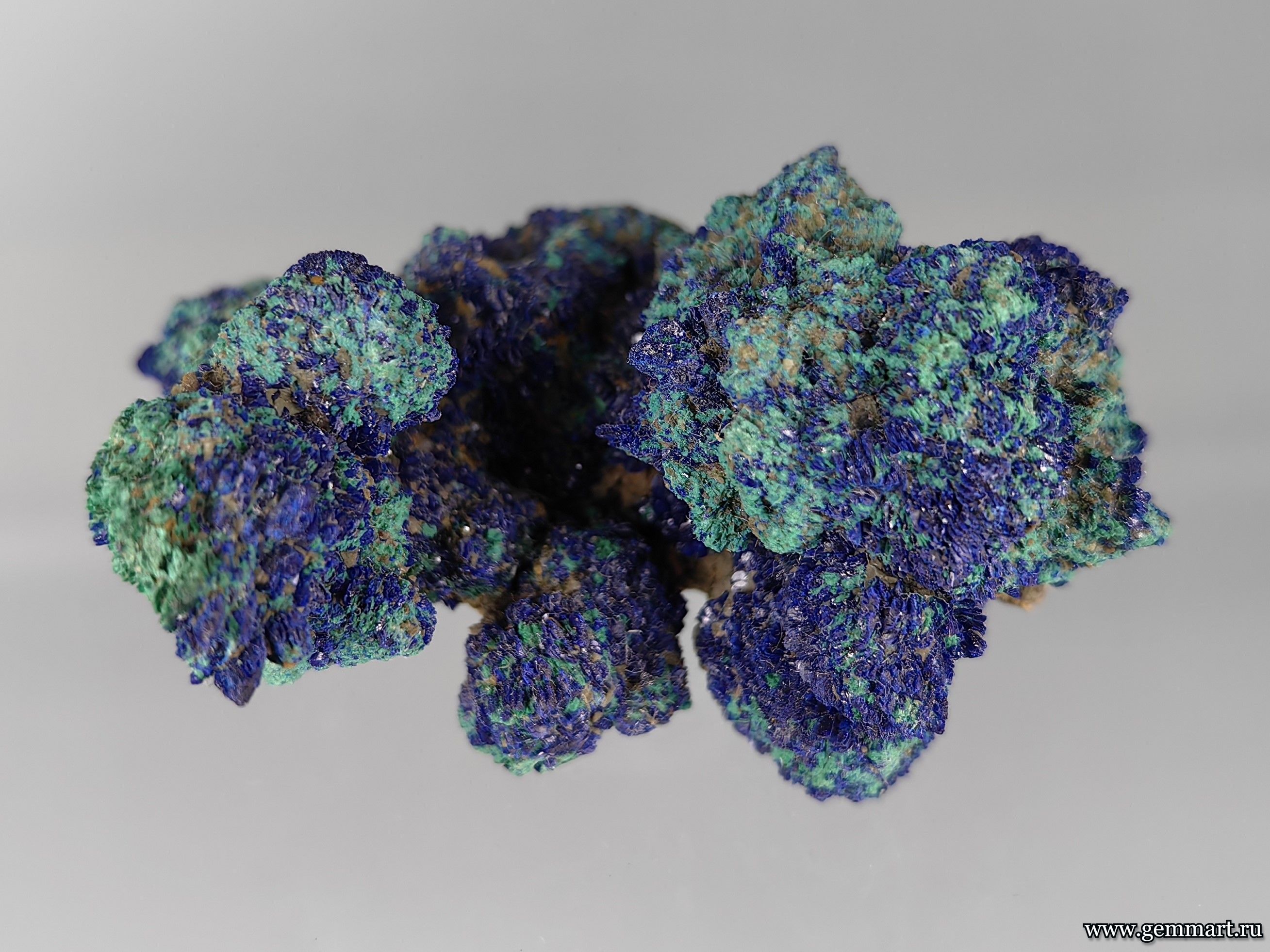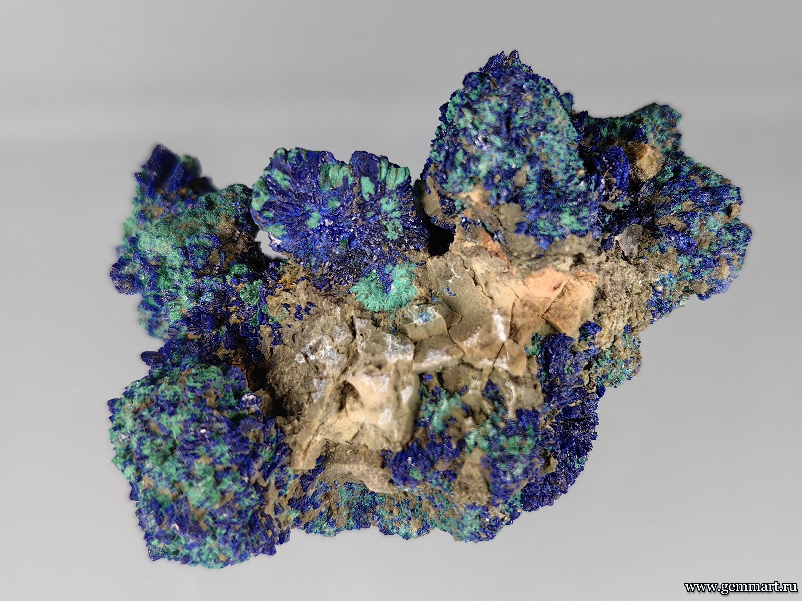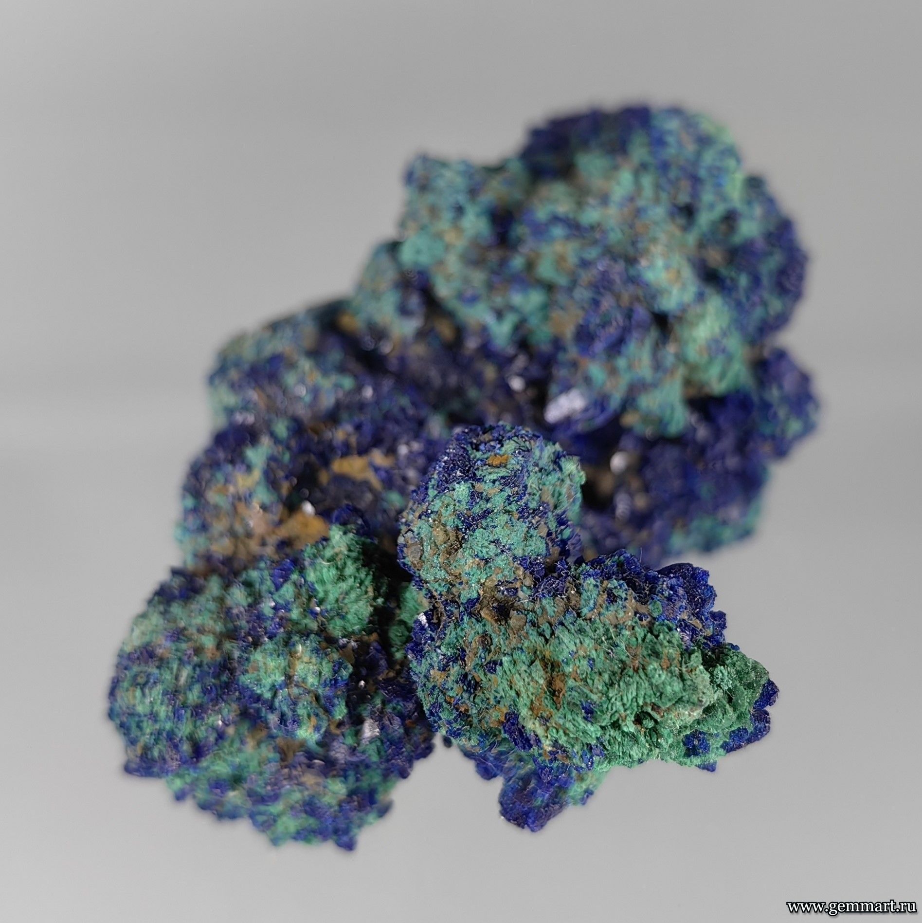 Вес 50г Размер 50*40*30мм Описание Азурит, частичное замещение малахитом кристаллов азурита. Месторождение Карашошак (Cu) месторождение. Улытауская область. Казахстан. Формат коллекции Миниатюра / Miniature - от 10 до 60мм -