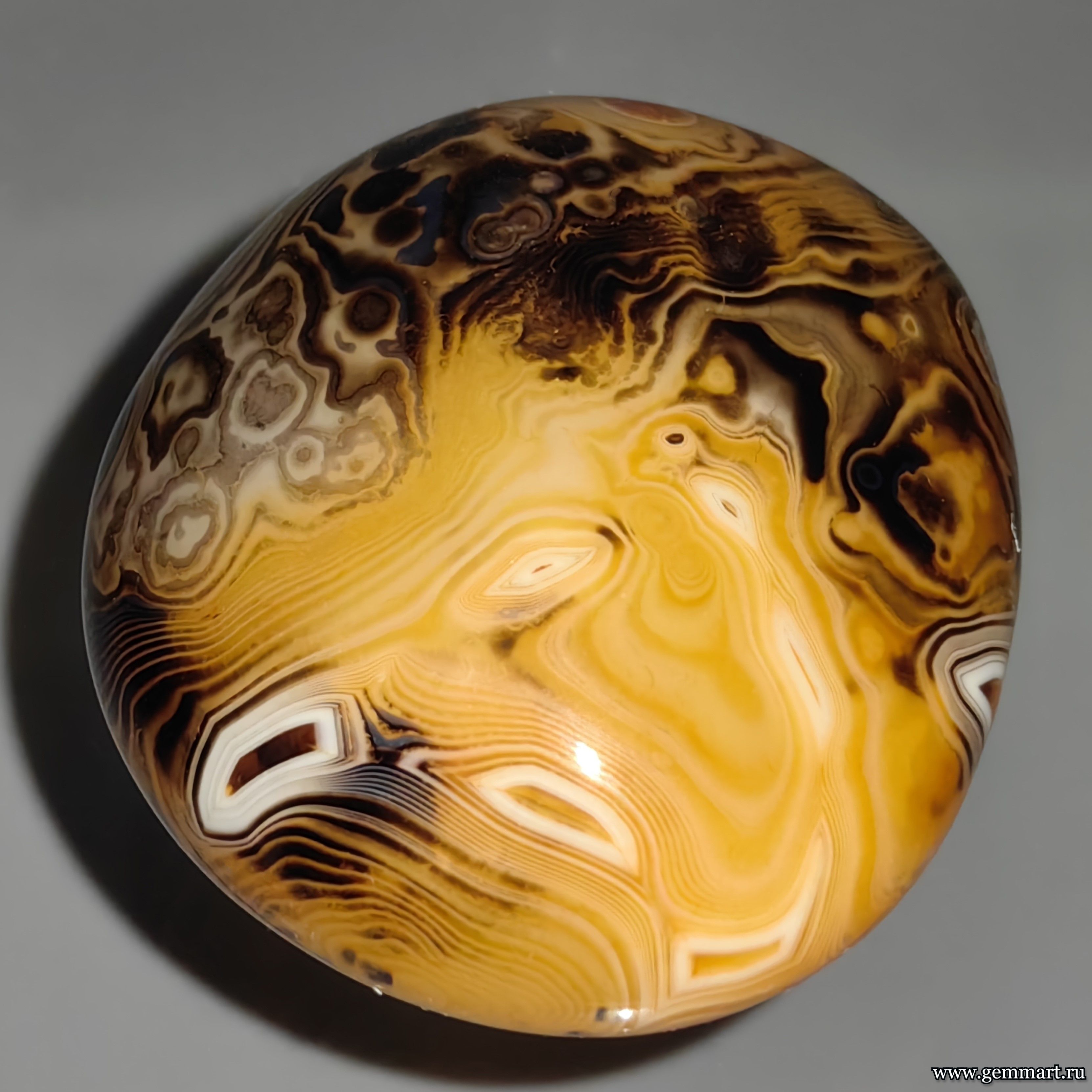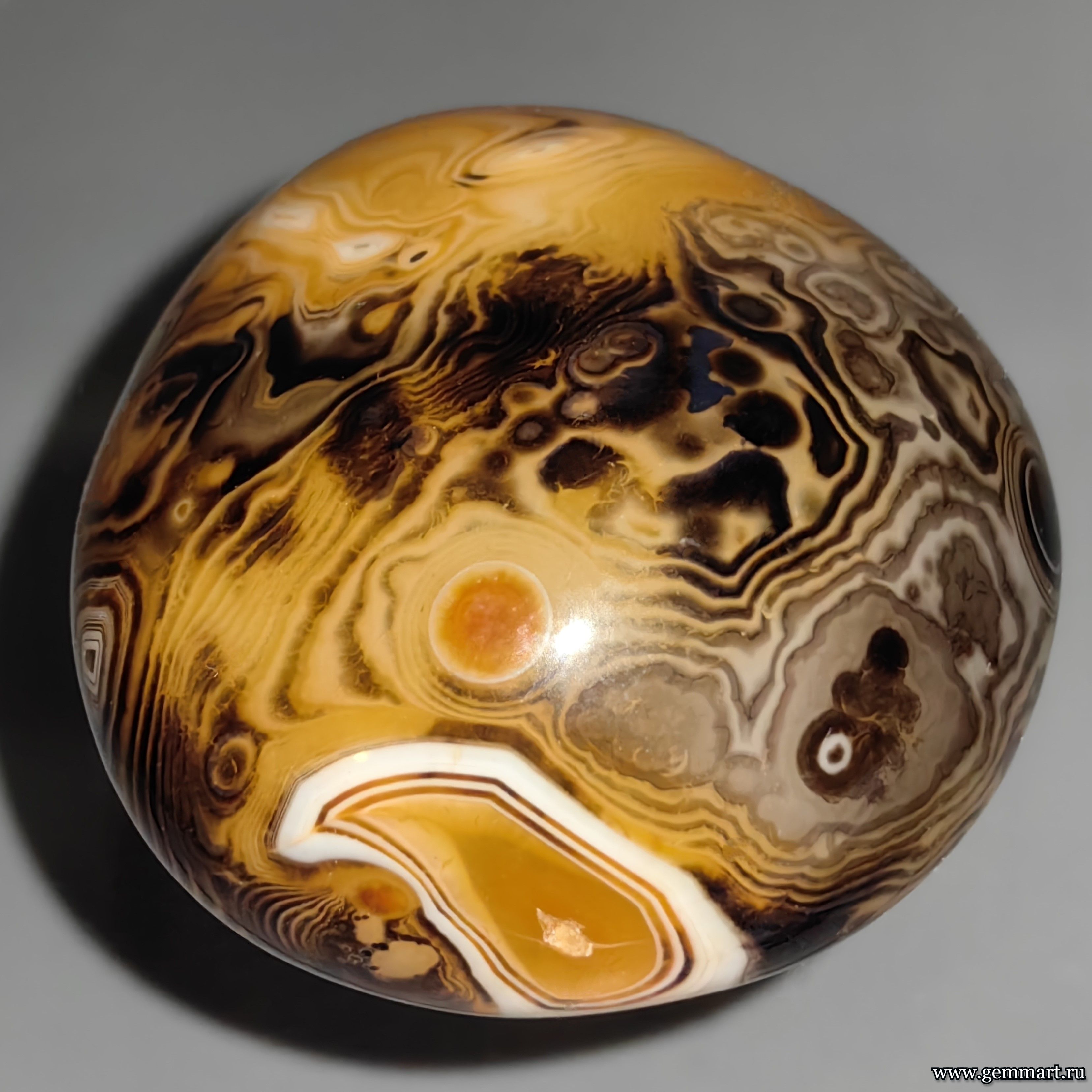 Вес 100г Размер 55*47*30мм Описание Агат, галтель. Облагорожен нагреванием. Месторождение Мадагаскар. Формат коллекции Миниатюра / Miniature - от 10 до 60мм -