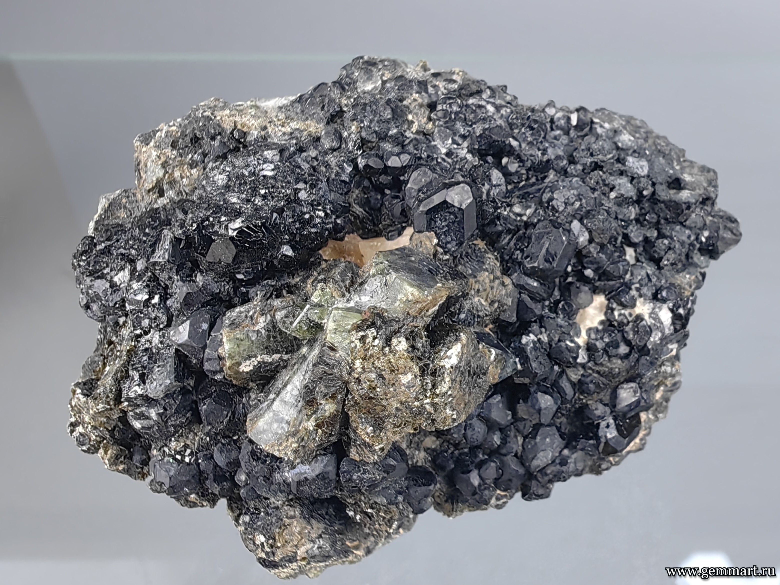 Вес 125г Размер 65*47*32мм Описание Шпинель черная, диопсид, кальцит. Россия. Месторождение Гон месторождение. Якутия. Россия. Формат коллекции Кабинетный / Cabinet - от 60мм до 150мм -